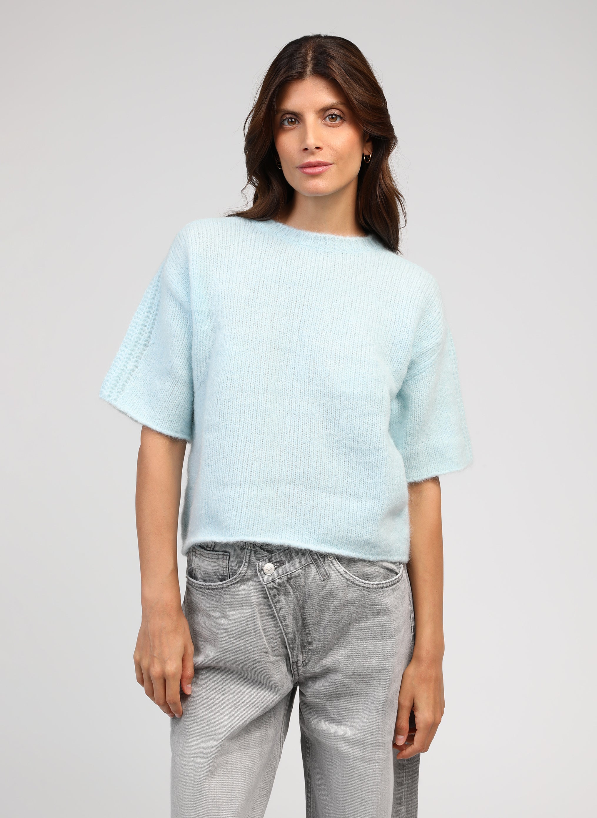 Knitted t-shirt style top in a light blue they call Lagoon.