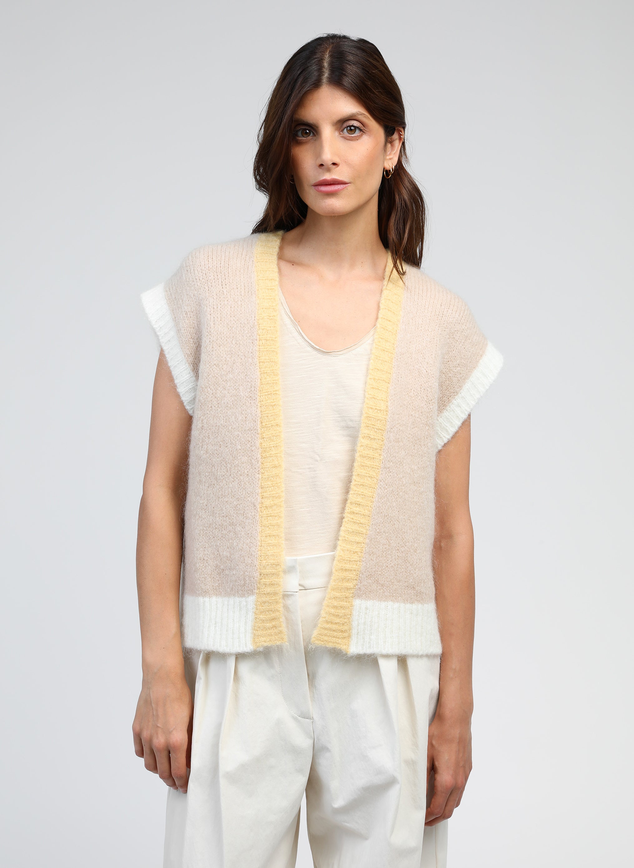 Sleeveless cardigan with open design and dropped shoulders. Comes in beige with block colour trimmings.