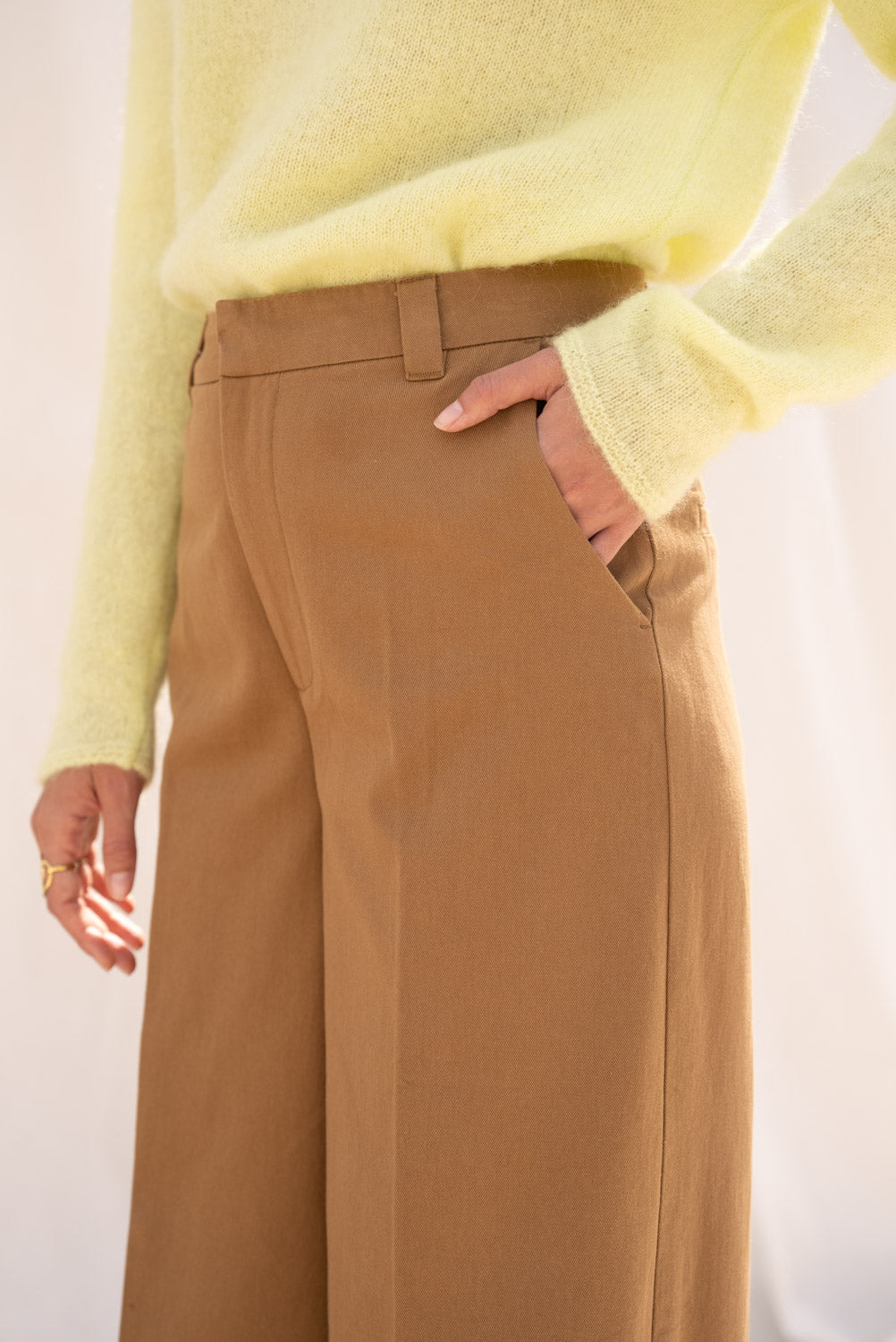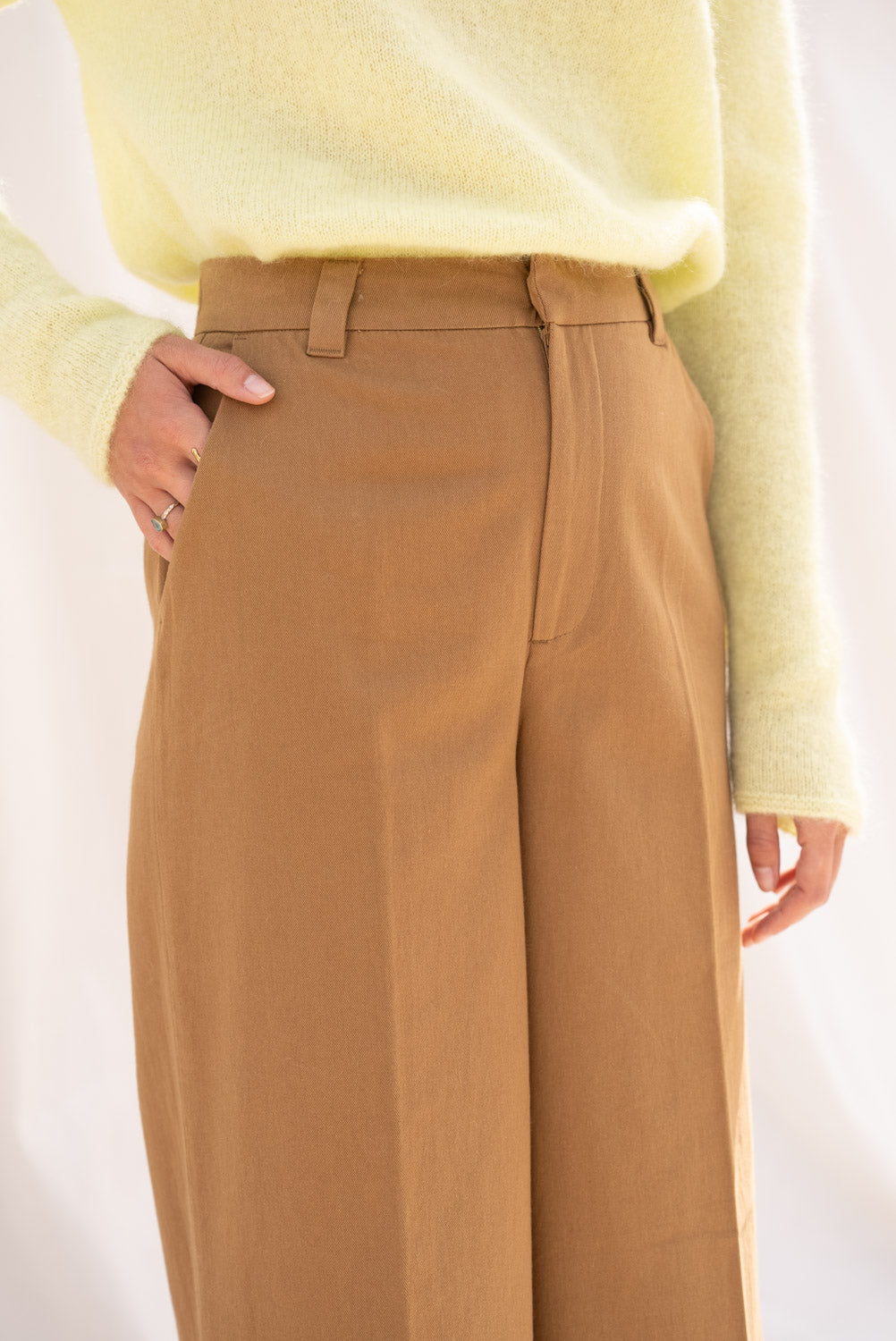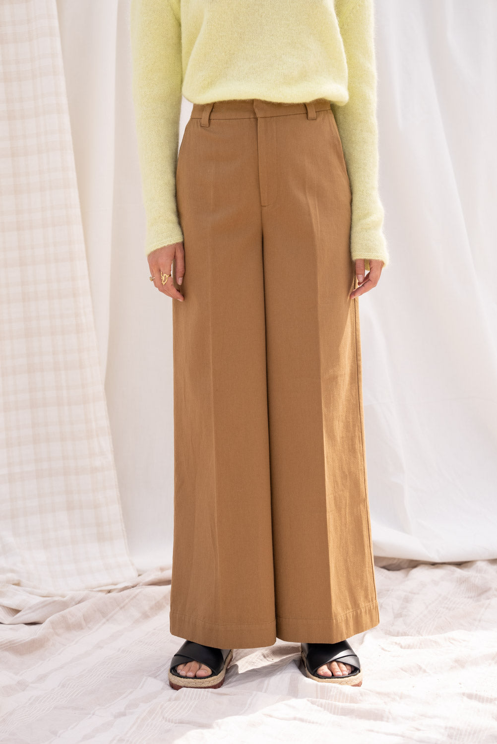High waisted suit trousers with wide leg and centre line press. Side pockets and belt loops.
