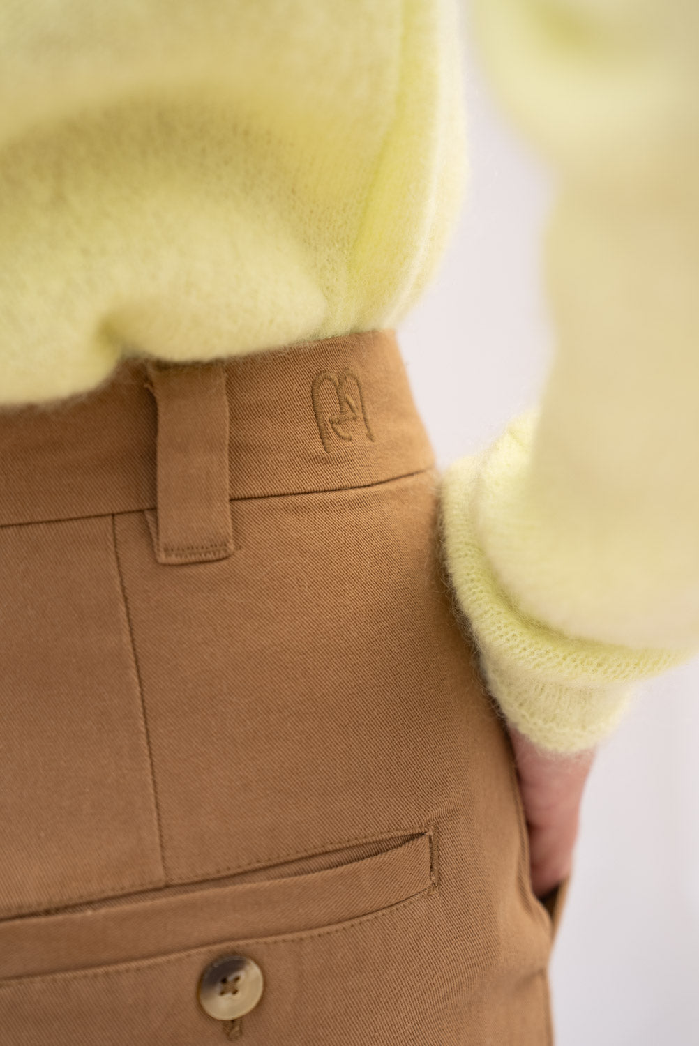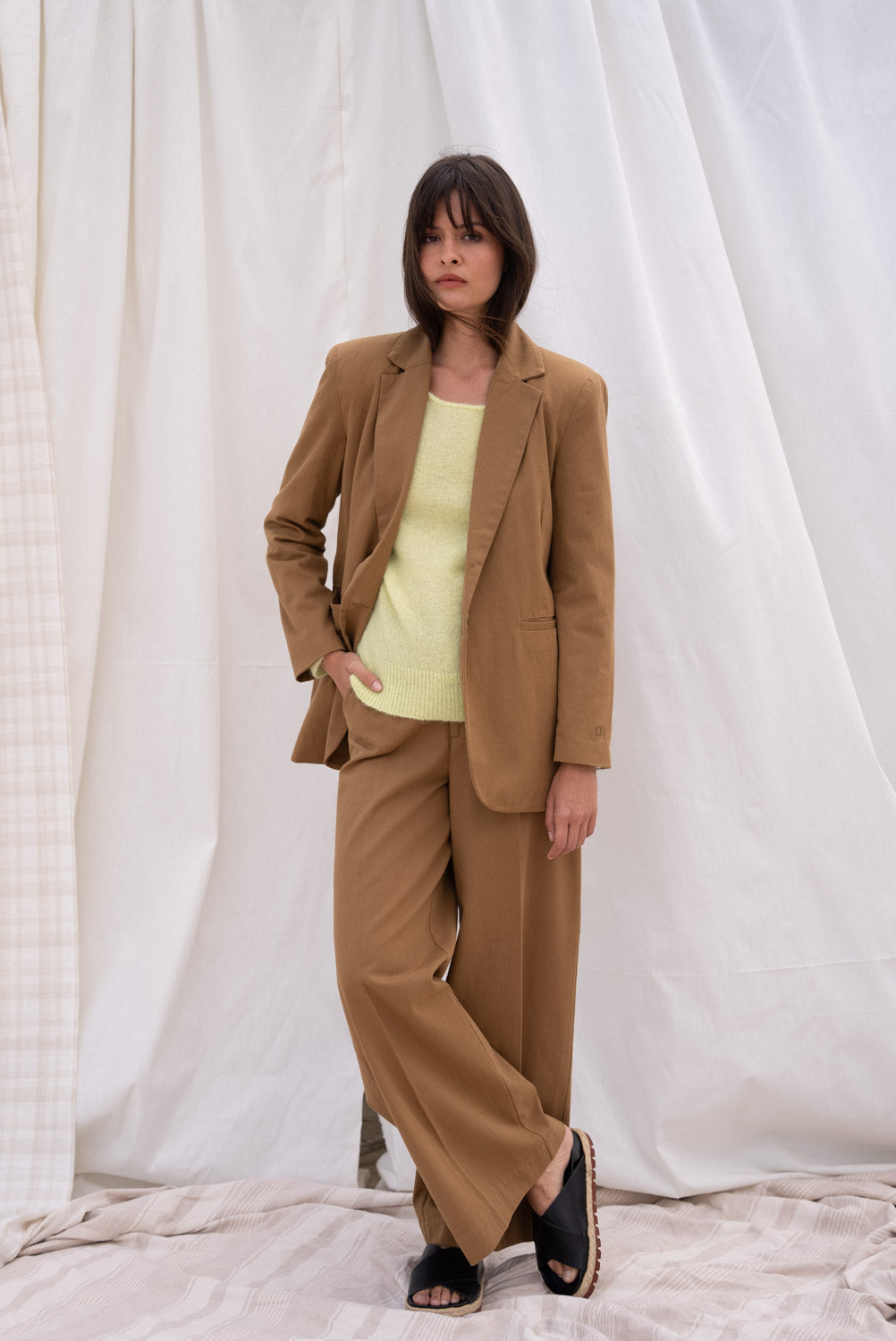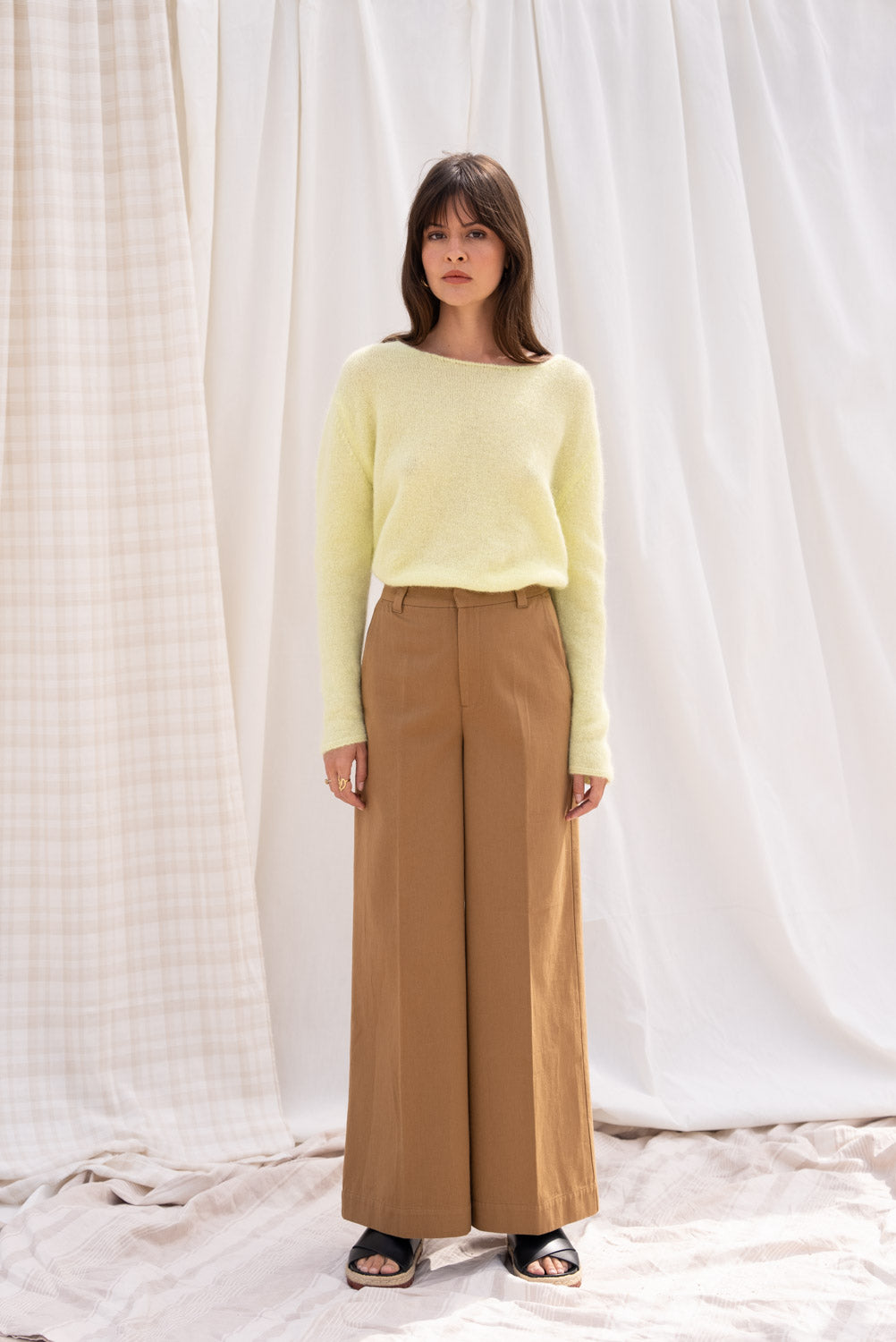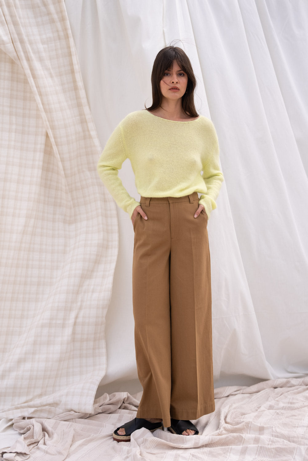 High waisted suit trousers with wide leg and centre line press. Side pockets and belt loops.