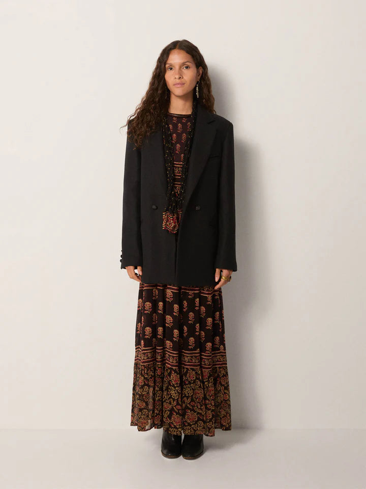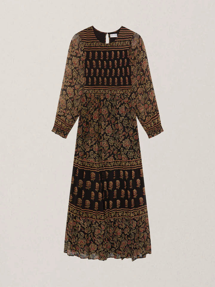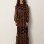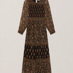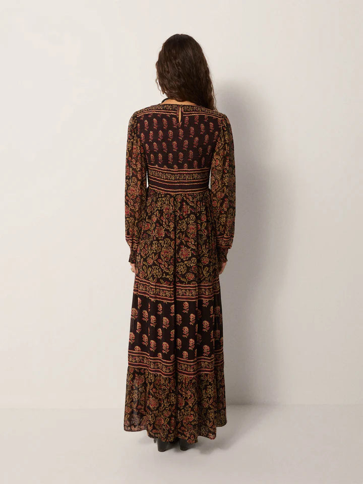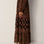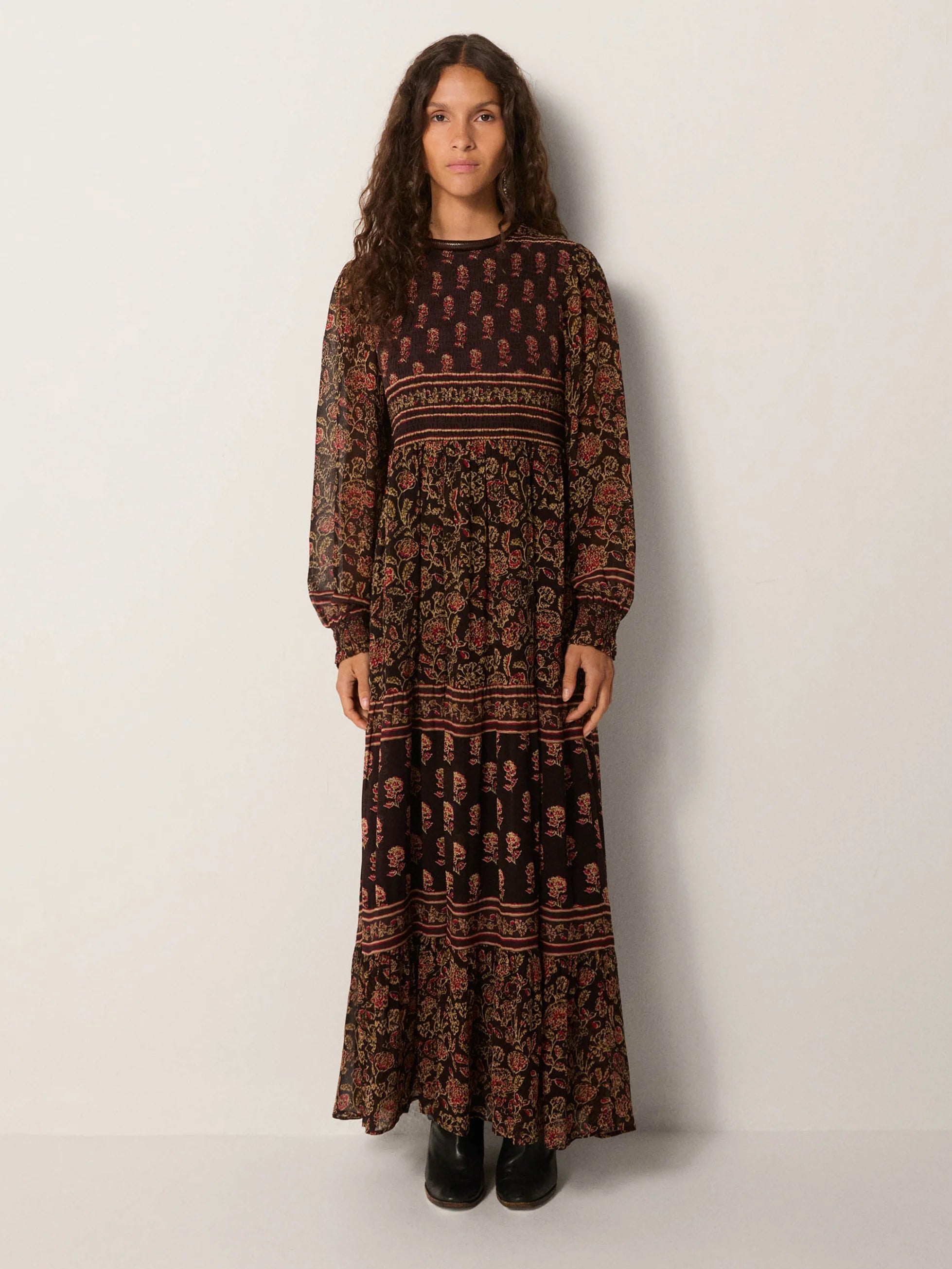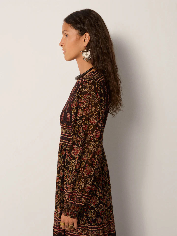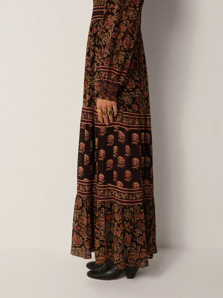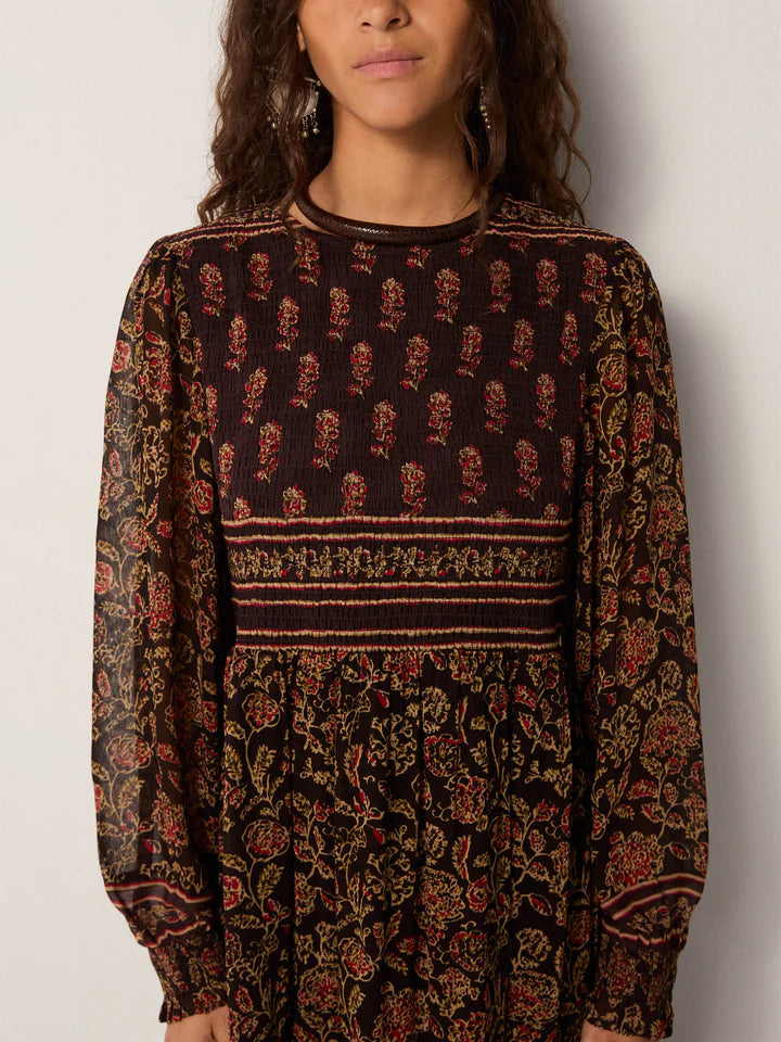 Its dark base is adorned with floral and border motifs in warm shades of red, ochre, and moss. Each tier is defined by rhythmic prints, while the smocked cuffs and round neckline add refinement.