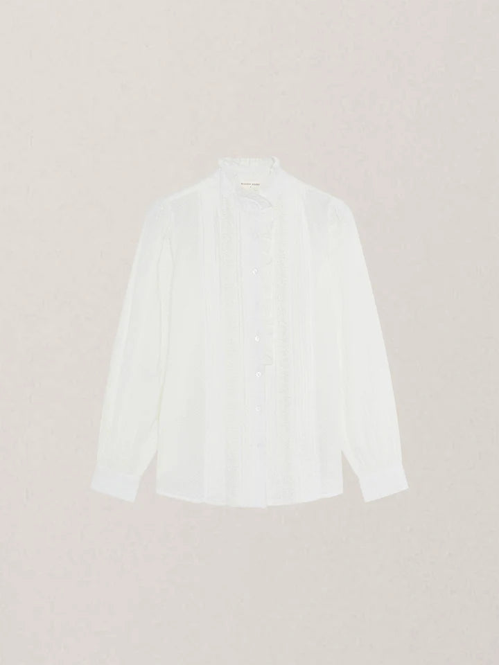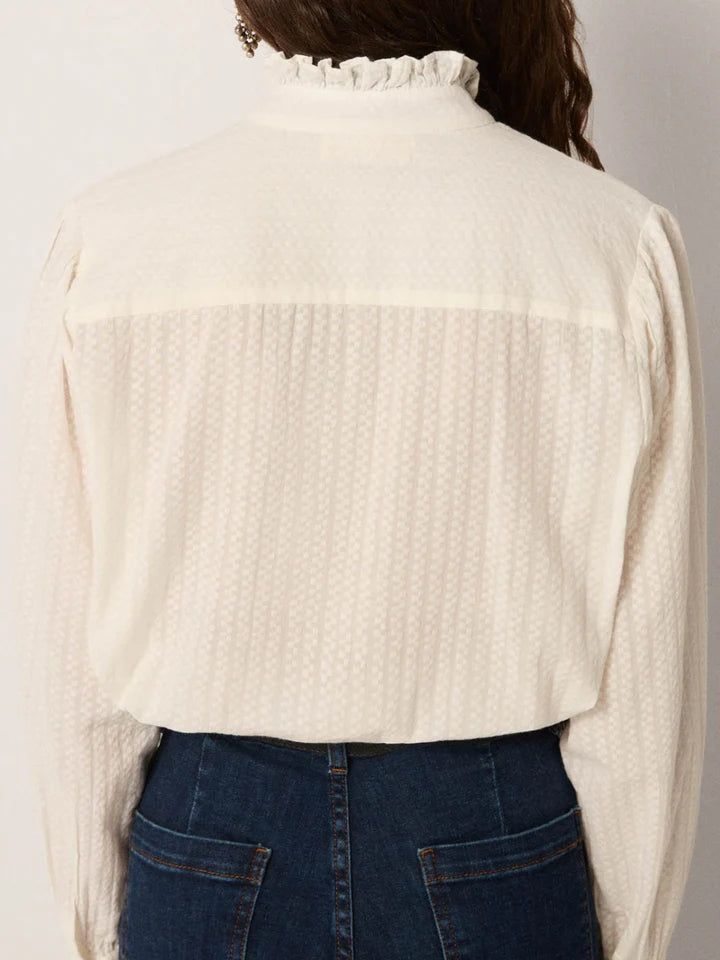 Crafted in soft cotton dobby with shiffli, the Bella Blouse brings a subtle play of textures with delicate pin-tucks and ruffle detailing along the front.