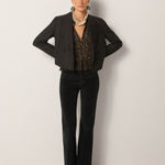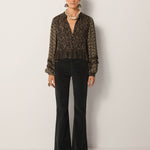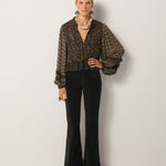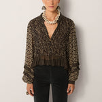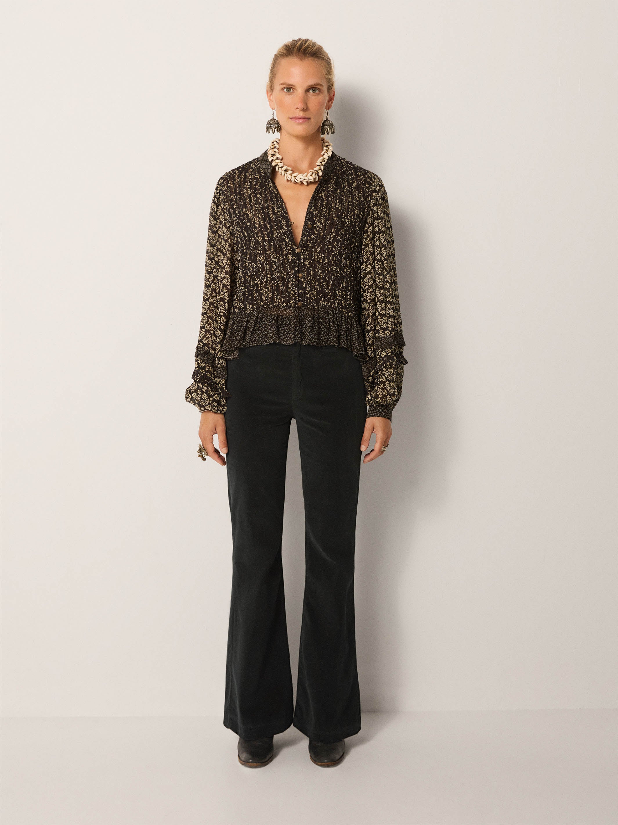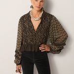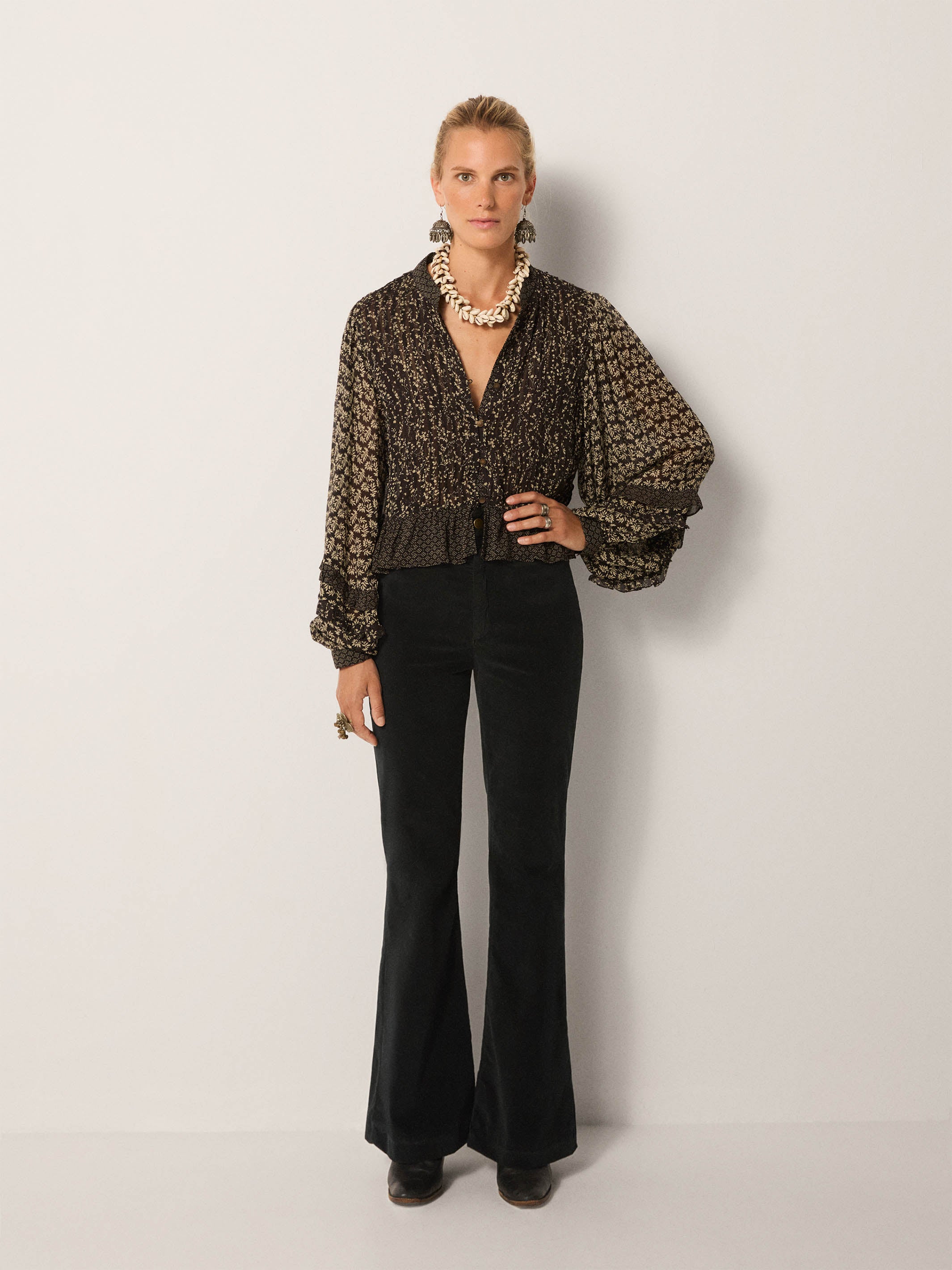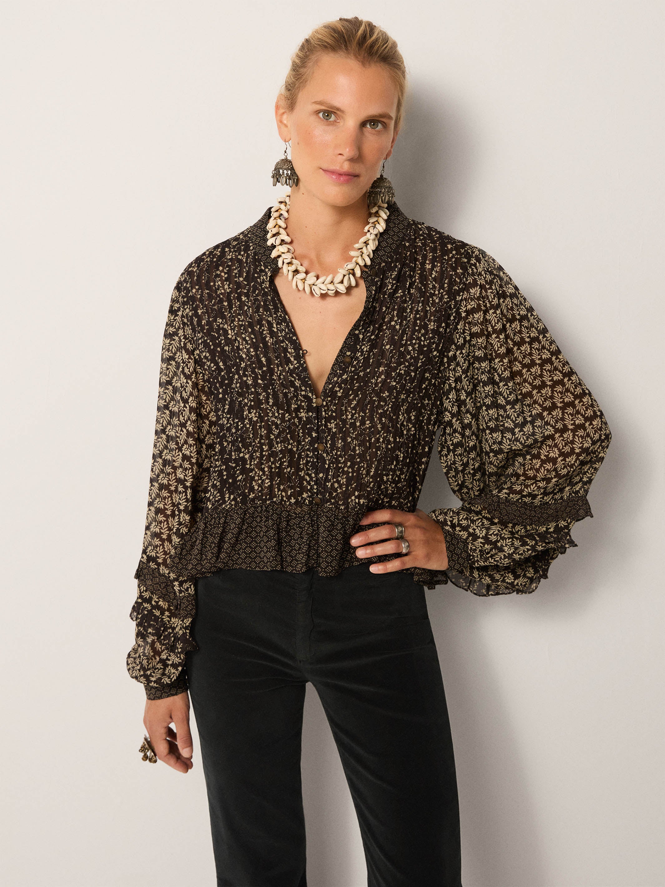 Designed with long sleeves finished in loose ruffles, and an additional ruffle panels along the hem that create rhythm as you move. Slight cropped, the neckline can be worn open thanks to its button closure allowing versatility in its mood.