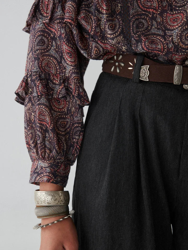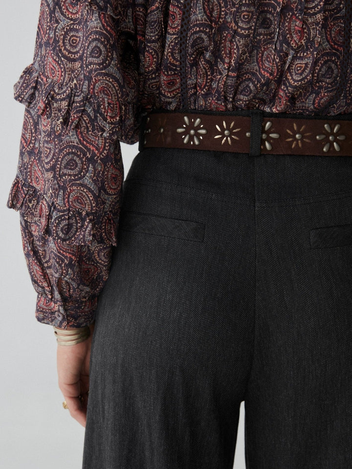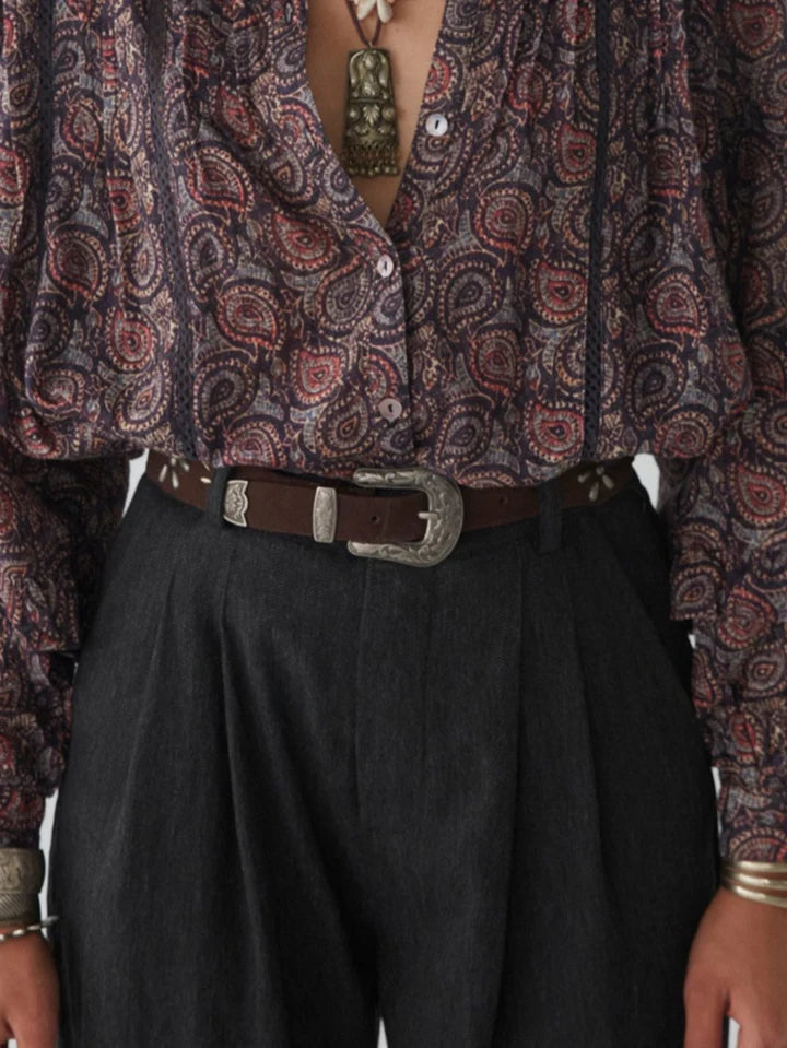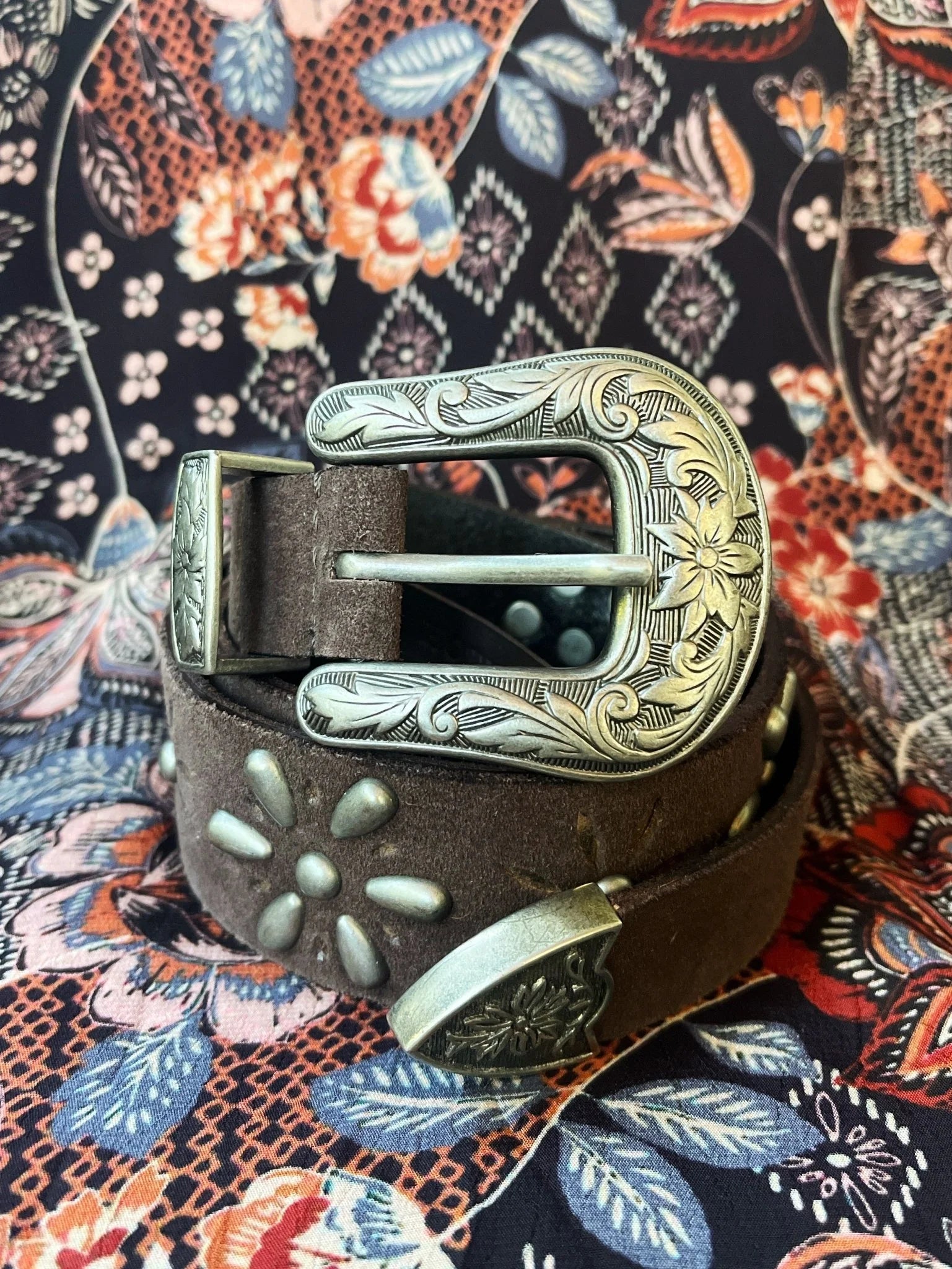 Made from 100% leather, the Daisy belt features a vintage replica antique silver buckle and has flowered shaped silver pieces running across the strap.