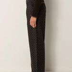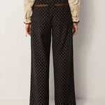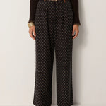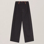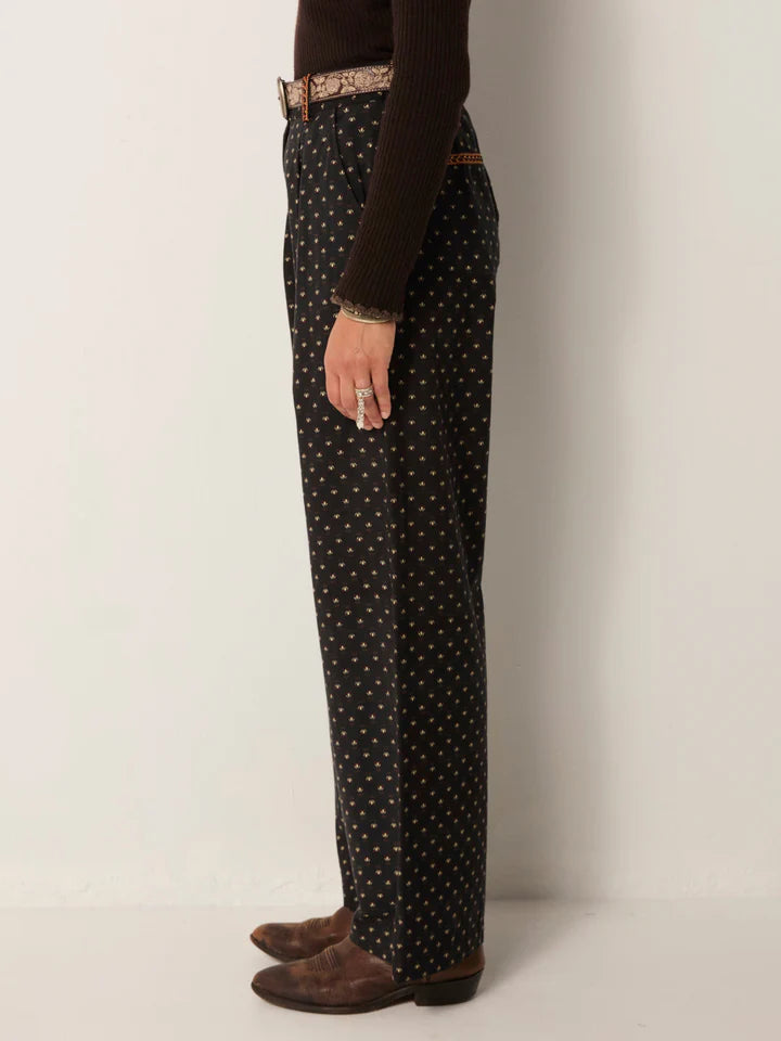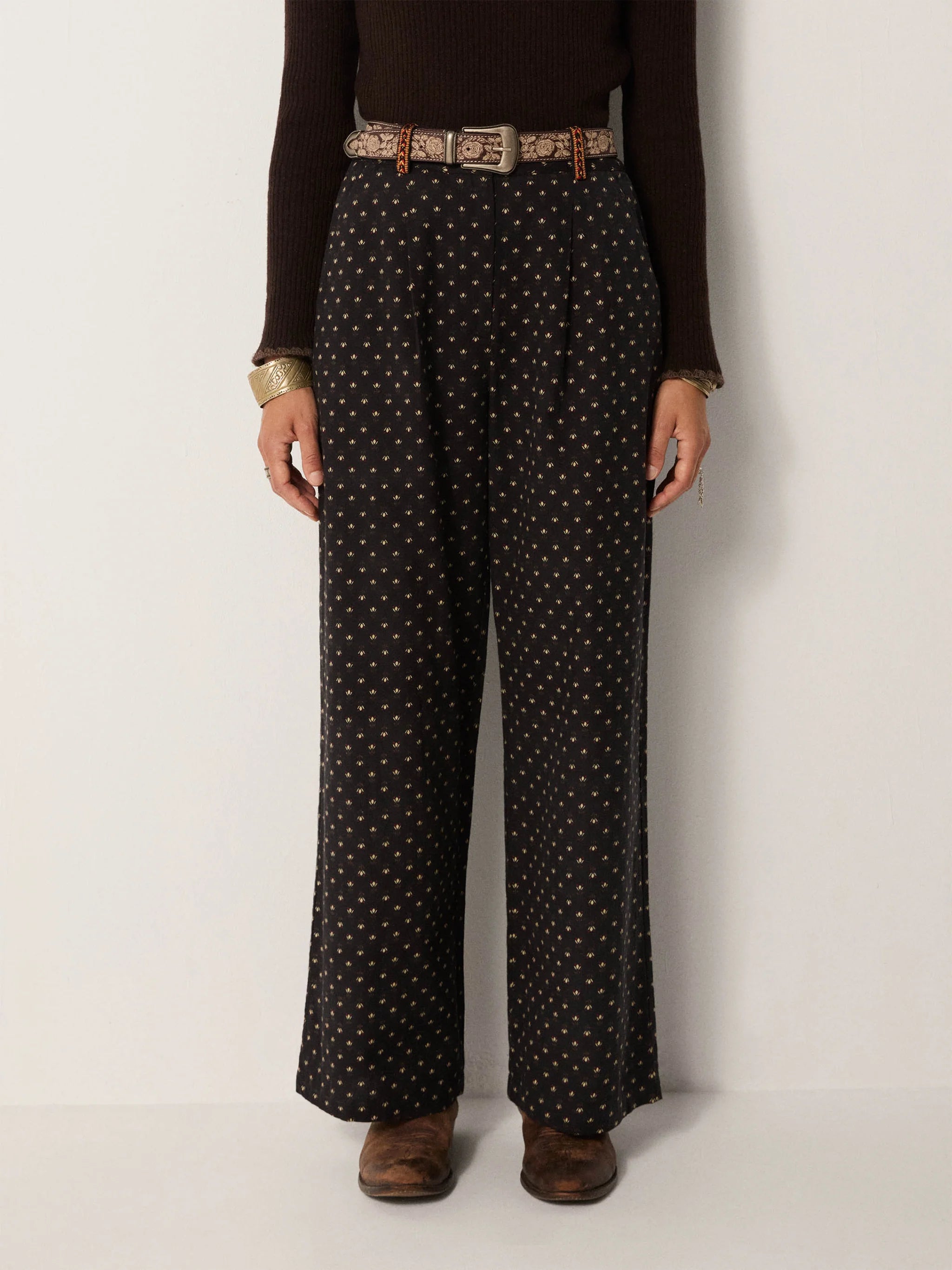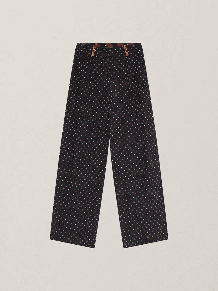 The deep black base is enriched with golden block–print motifs, subtle and artisanal. A relaxed high rise and pleated front complete the silhouette with understated ease.