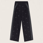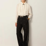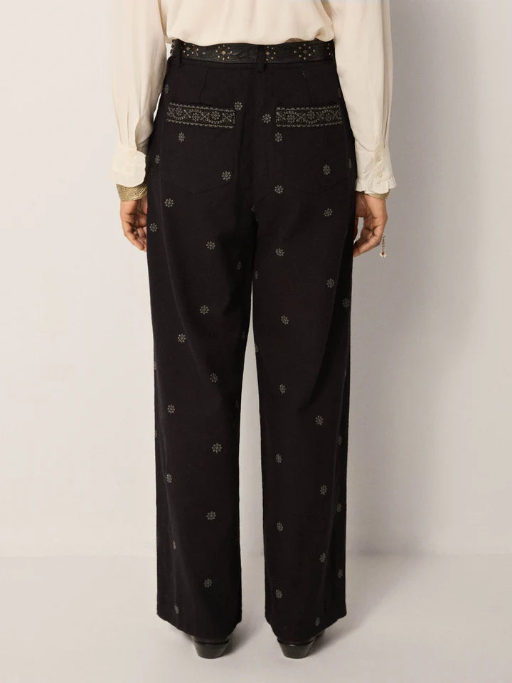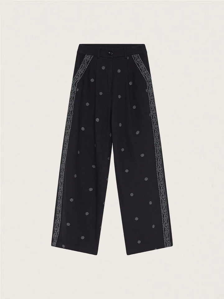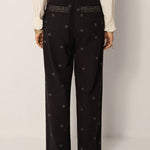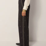 Cut in a soft, weighty cotton handloom, the Diego trousers arrive in a deep black base, scattered with subtle grey florals and framed by tonal embroidered side panels. The straight-leg silhouette falls fluidly, striking the balance between refinement and ease.