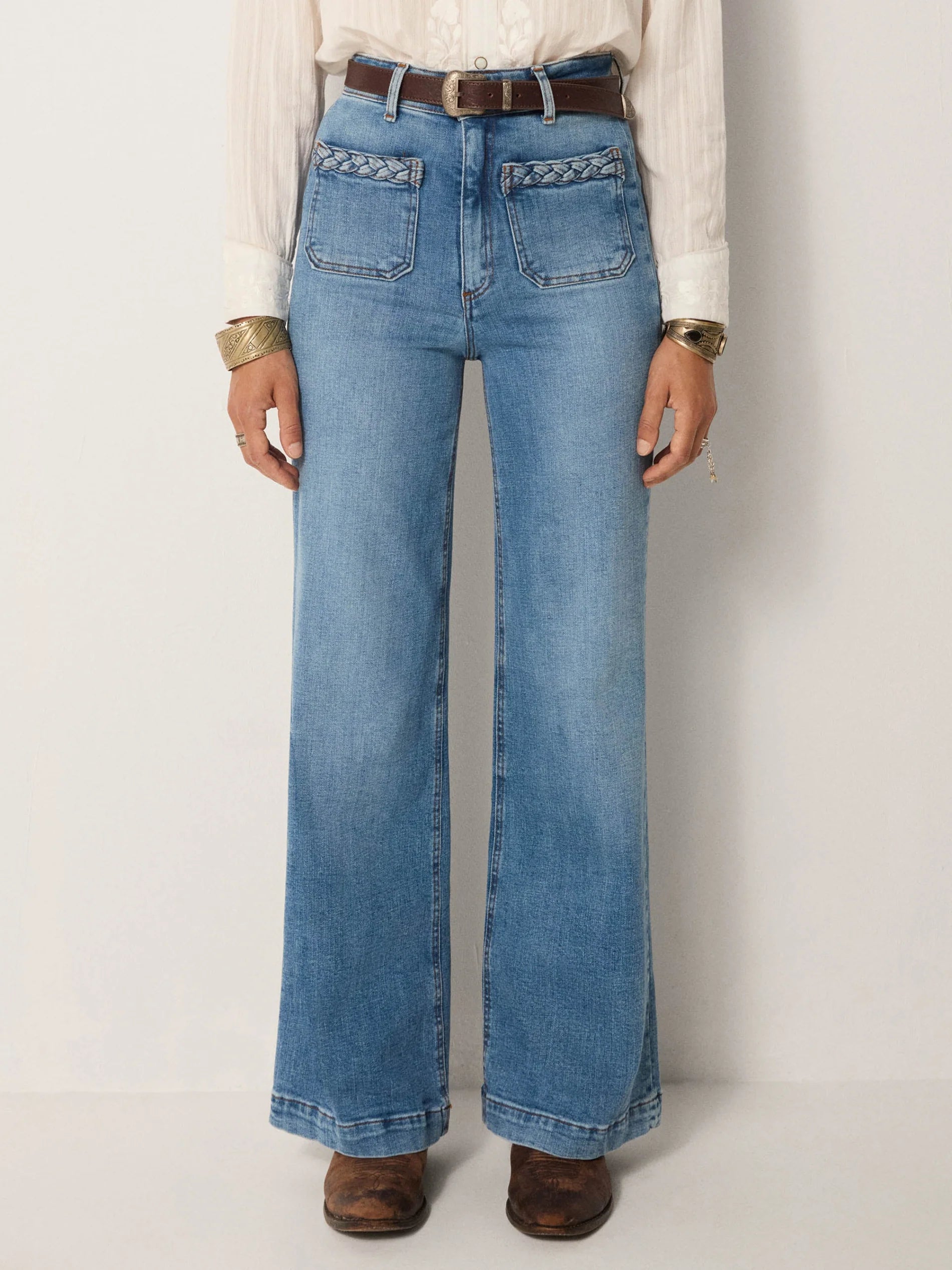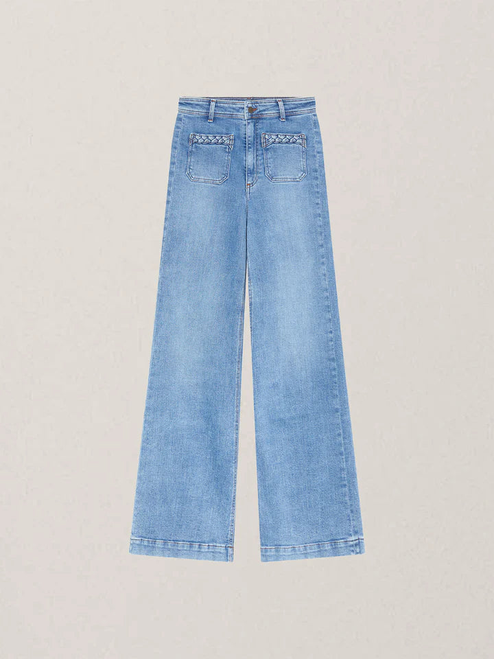 Its light indigo shade brings freshness, versatile enough for structured blouses or casual knits. Braided detailing at the pockets adds artisanal character.