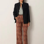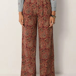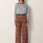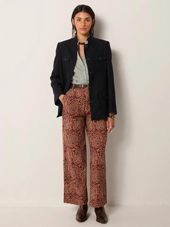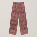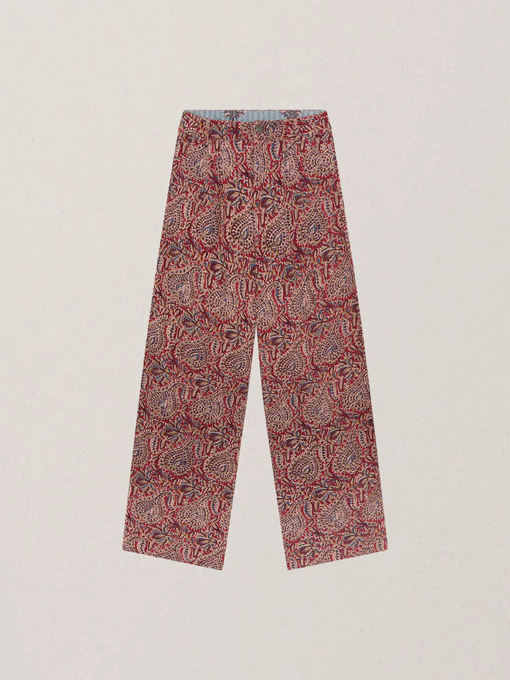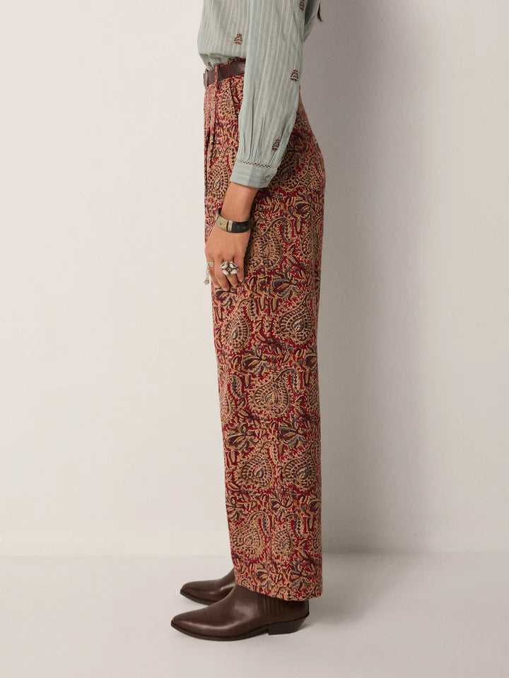 Wide-leg trousers in cotton micro-corduroy jacquard, drenched in deep burgundy and earthy sand tones. The swirling paisley pattern carries a richness that feels both grounded and ornate, like fabric collected from a far-off bazaar. Cut with volume through the leg and a high waist, they strike balance between comfort and statement.