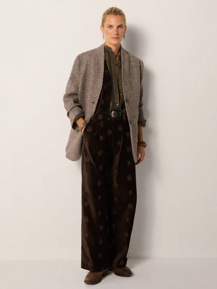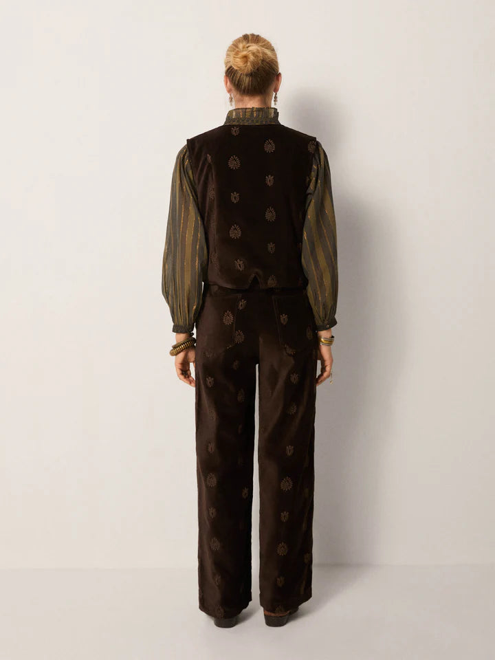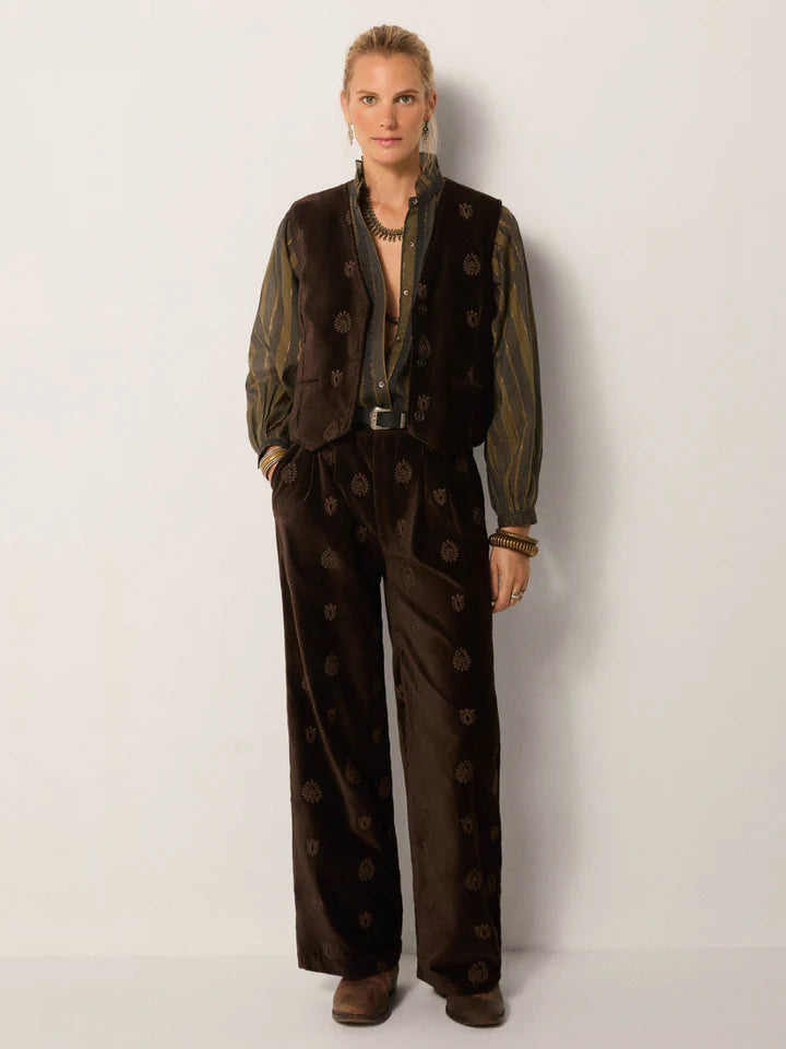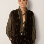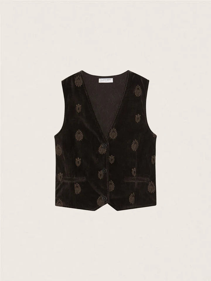 Crafted from plush cotton velvet, the Kafka Waistcoat is substantial yet soft, with a natural drape that holds its shape. The Macchiato tone — a warm brown softened by light — carries the richness of coffee beans mellowed by cream.