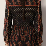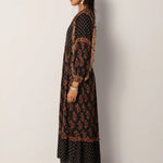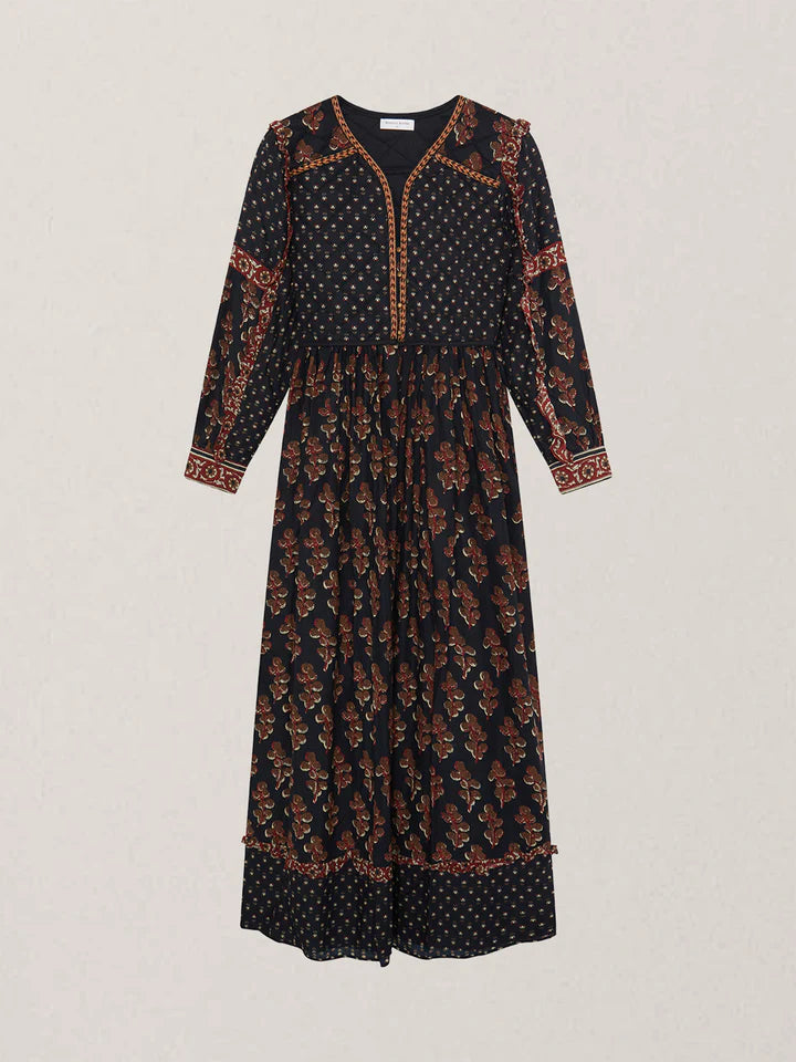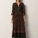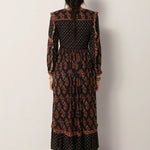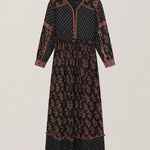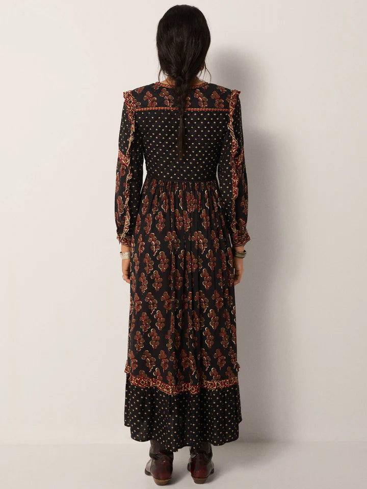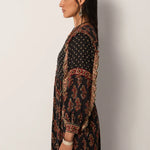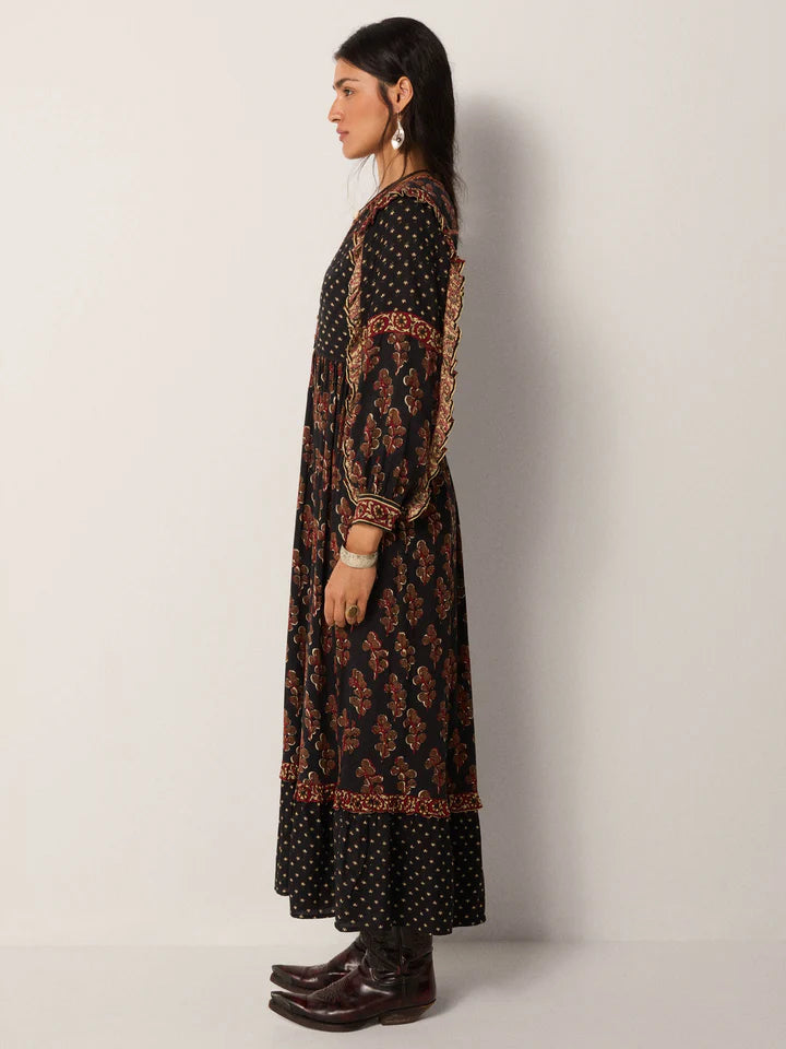 Cut in lightweight viscose dobby, the Lily Dress is where ease meets intricacy. Its flowing silhouette is fully adorned with prints that play across the dark ground, giving it movement, depth, and an unmistakable bohemian edge.