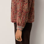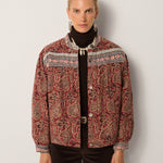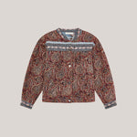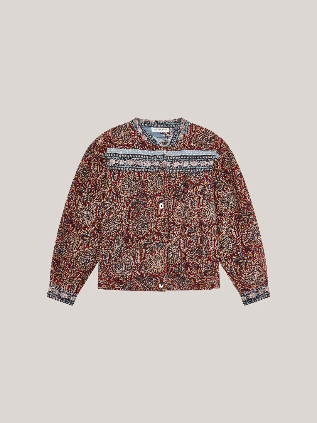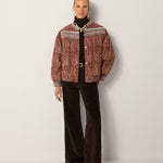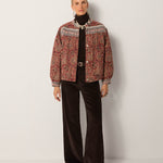 A boxy, button-up jacket cut from jacquard cotton canvas, saturated in deep burgundy, sand and indigo tones. The paisley pattern unfolds like a woven tapestry, intricate yet relaxed in feel. Lightly padded for structure, it balances warmth with ease.