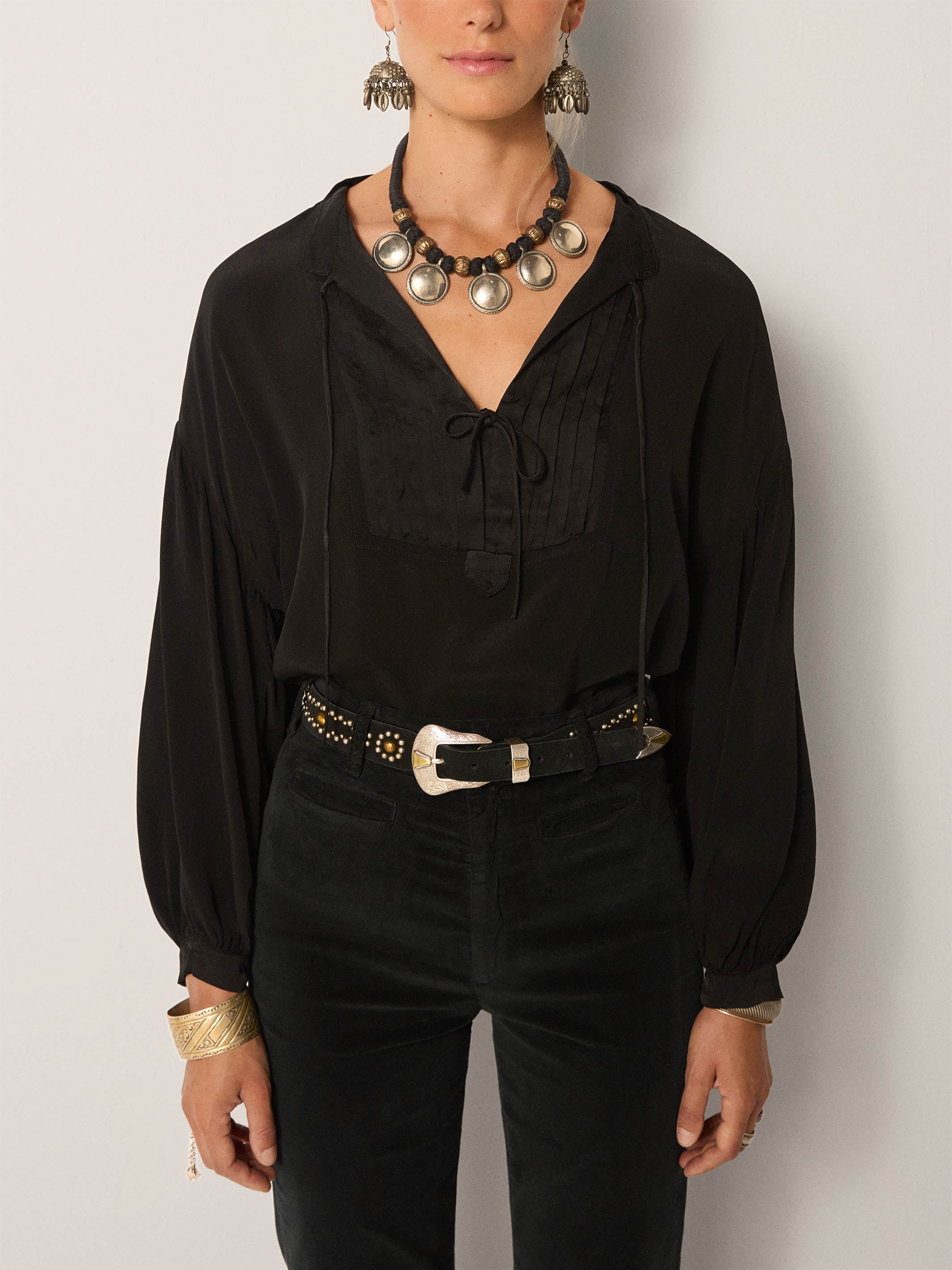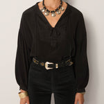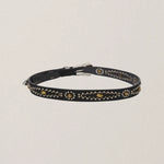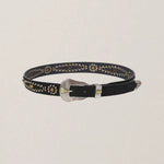 The Pancho belt Midnight Silver Belt is a western-inspired piece in soft black leather. Designed with a finely engraved silver buckle featuring golden accents and studded details, it’s the perfect accessory to add character and definition to any look.