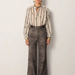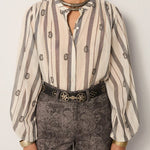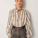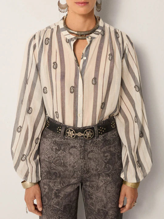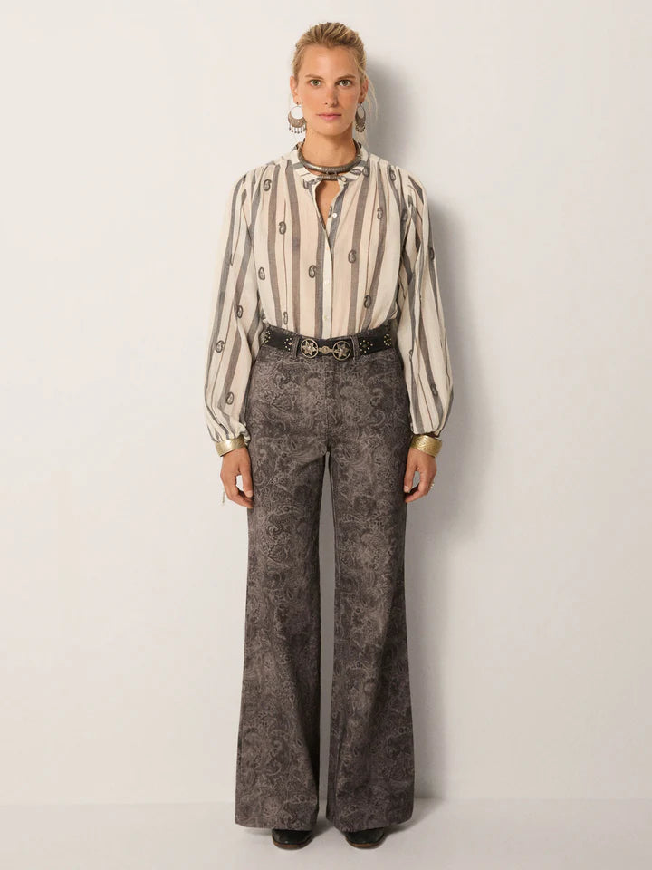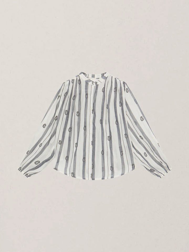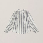 Vertical stripes break into small paisley motifs, running in muted greys and lilacs that create movement across the body. The pattern recalls antique woven cloth, understated yet distinct.