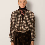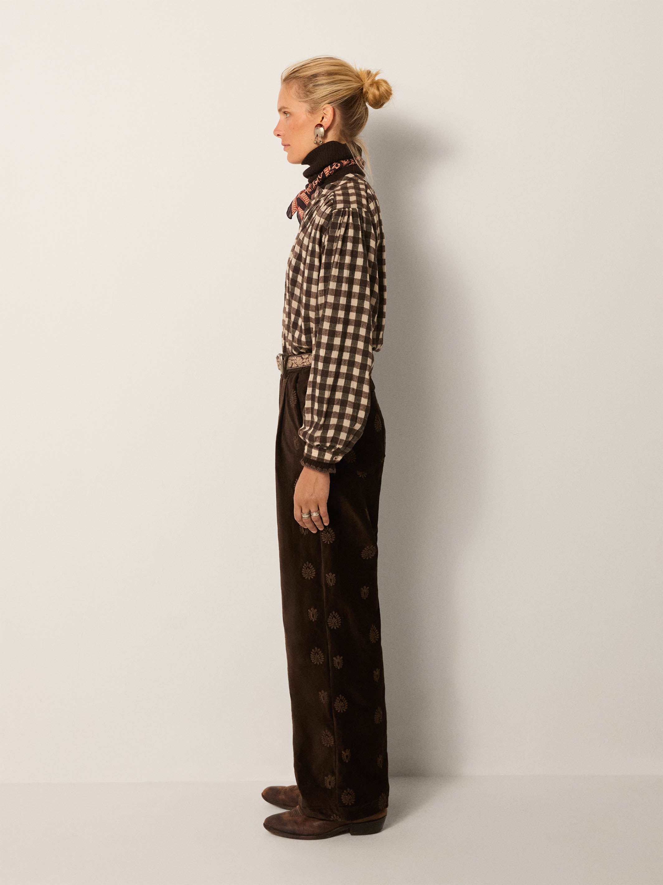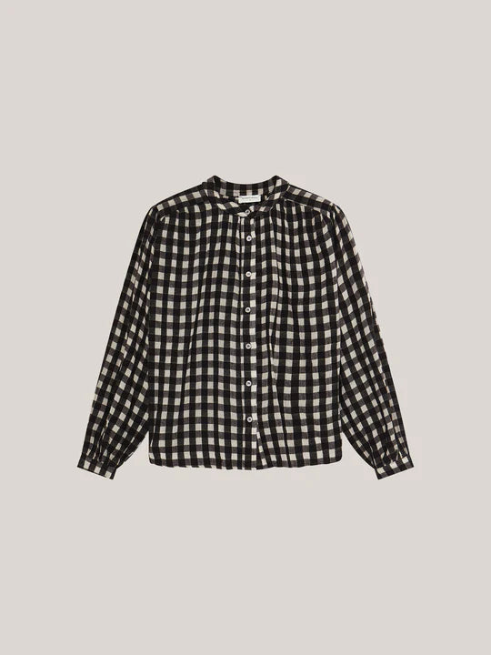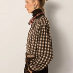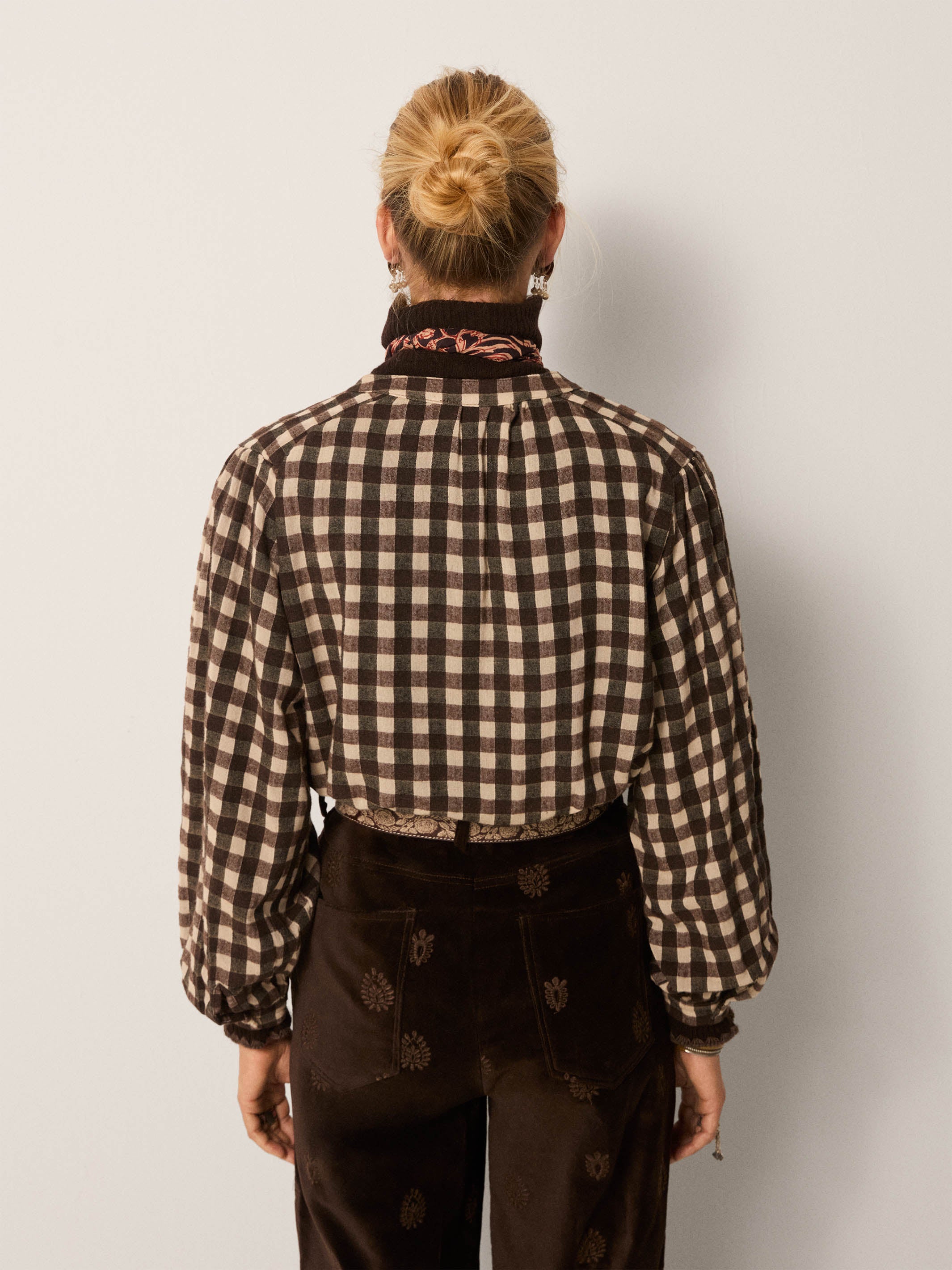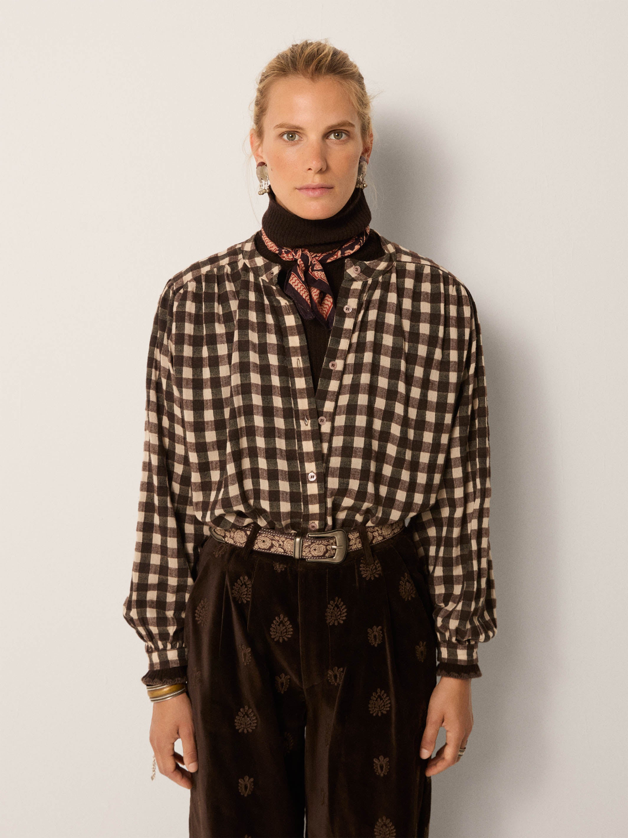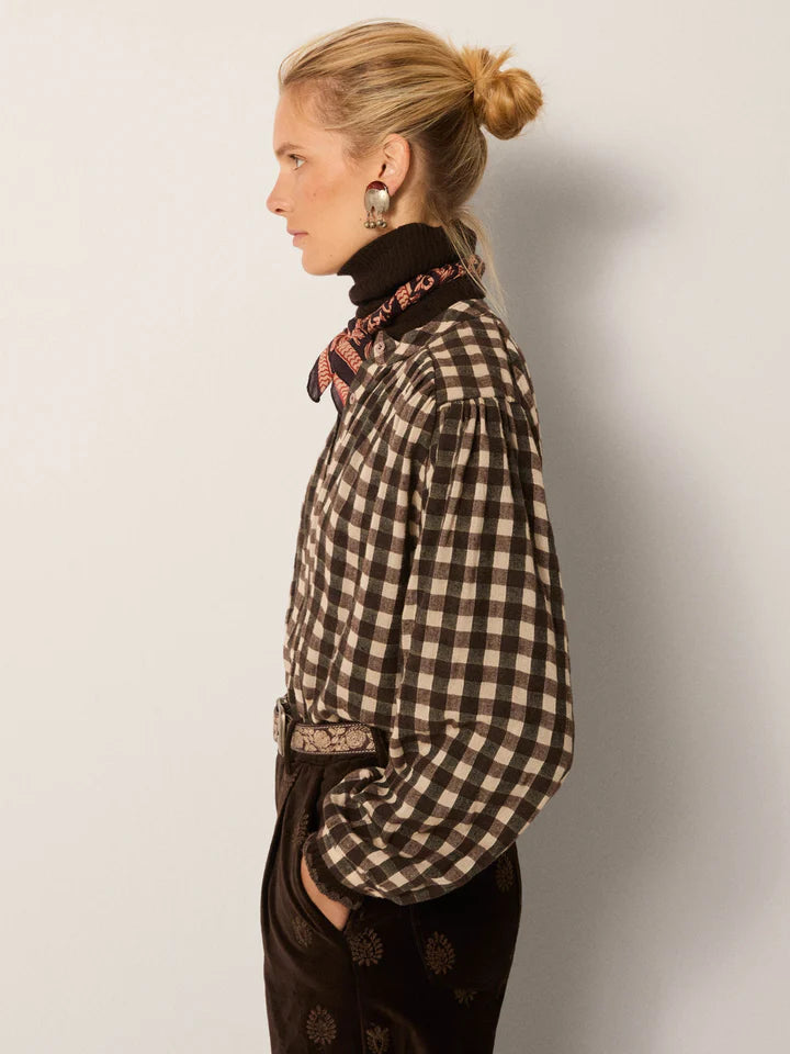 Cut in soft cotton flannel, the Rebecca blouse brings an easy warmth. The deep brown and cream gingham check nods to the classic, washed down to feel lived–in and familiar.
