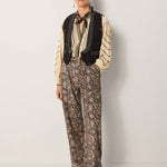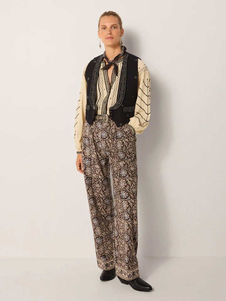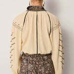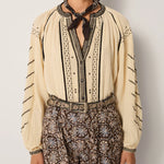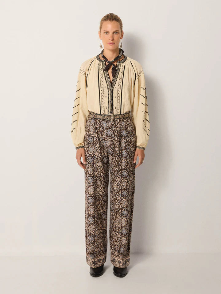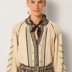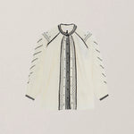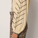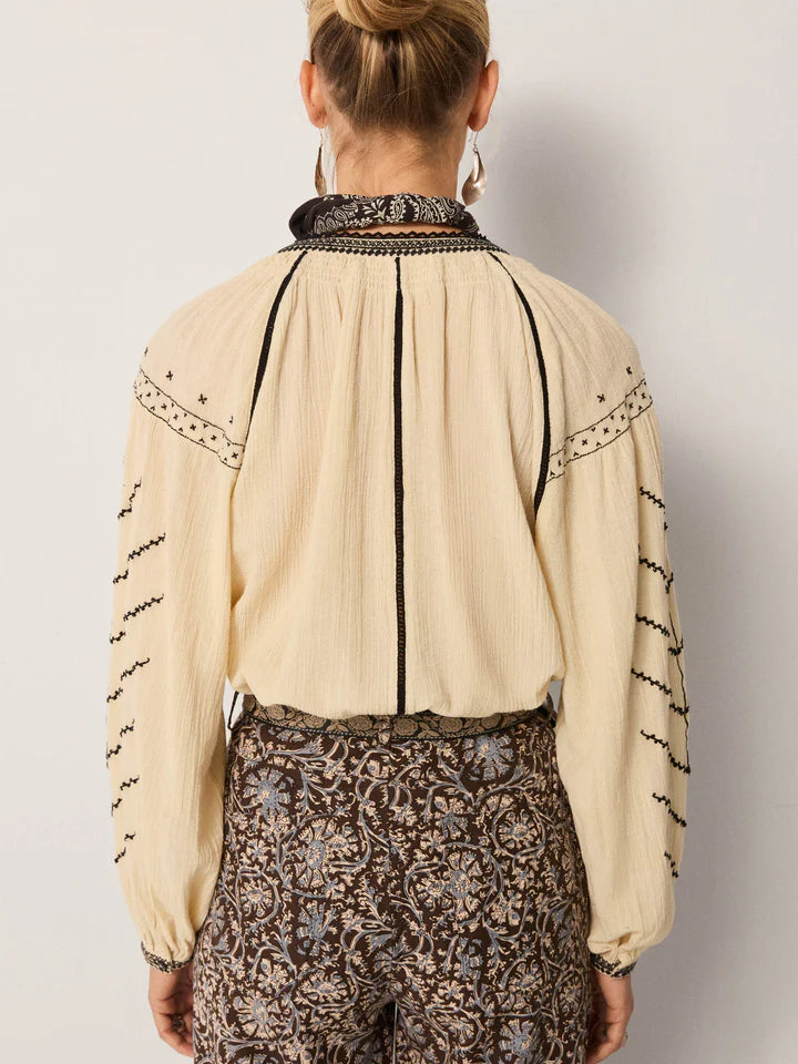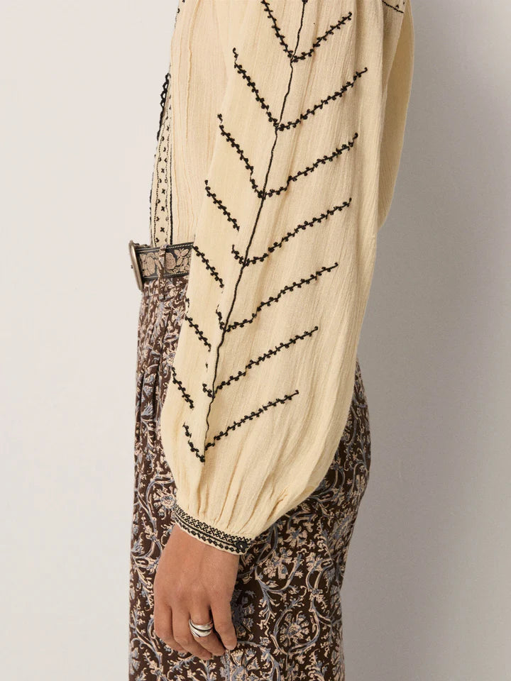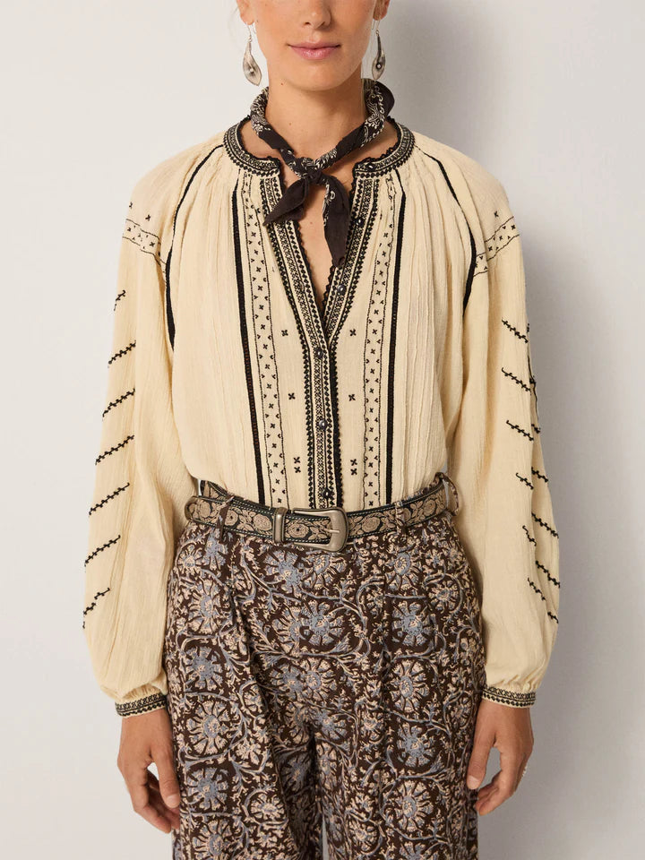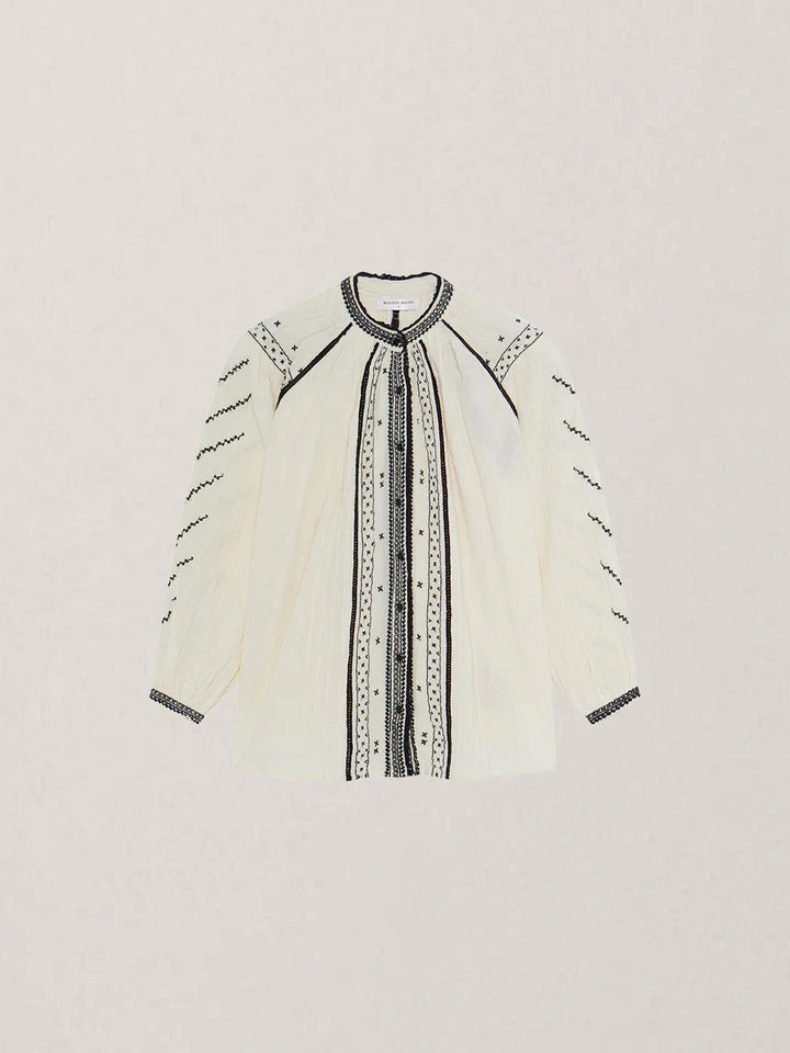 Intricate black embroidery traces placket, shoulders and sleeves. The sharp motifs stand out against ivory, striking but timeless.