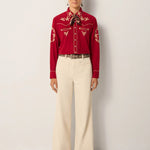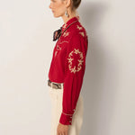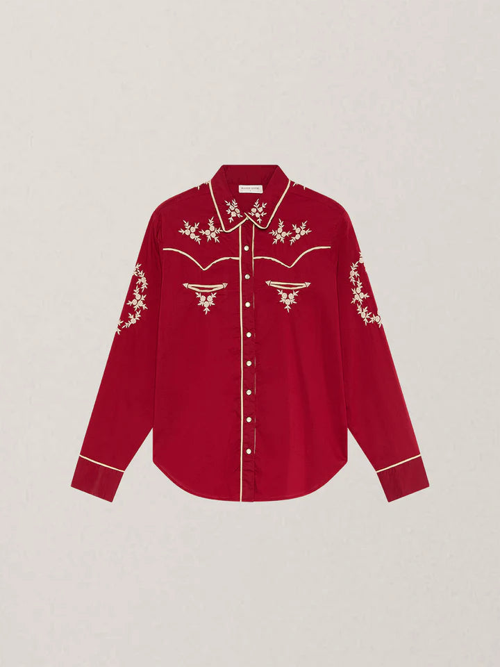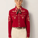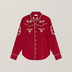 Intricate contrast embroidery traces the chest, sleeves, and back, accented with piping and snap buttons that highlight its cowboy character. The red tone gives it presence without overwhelming.