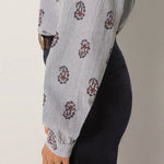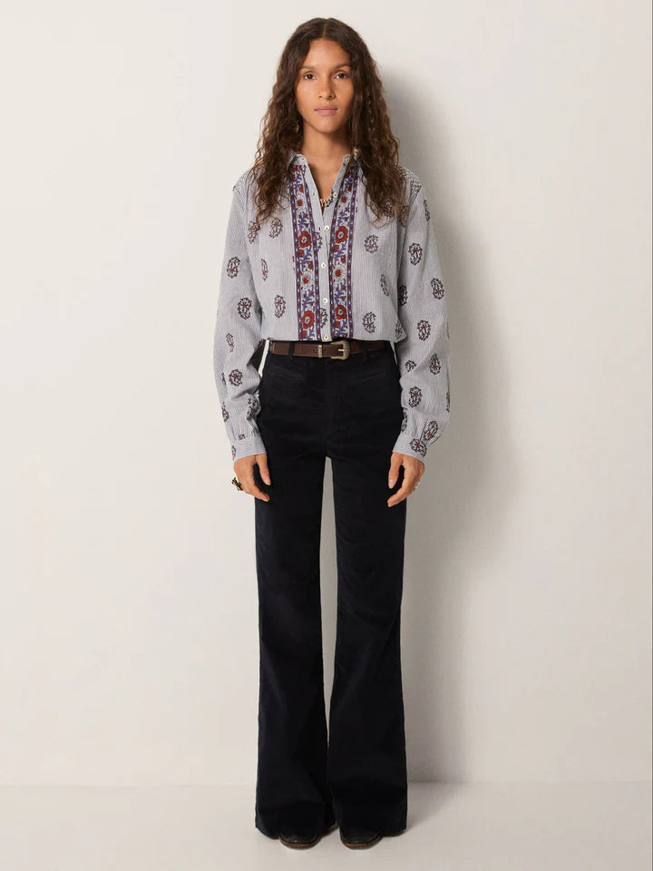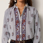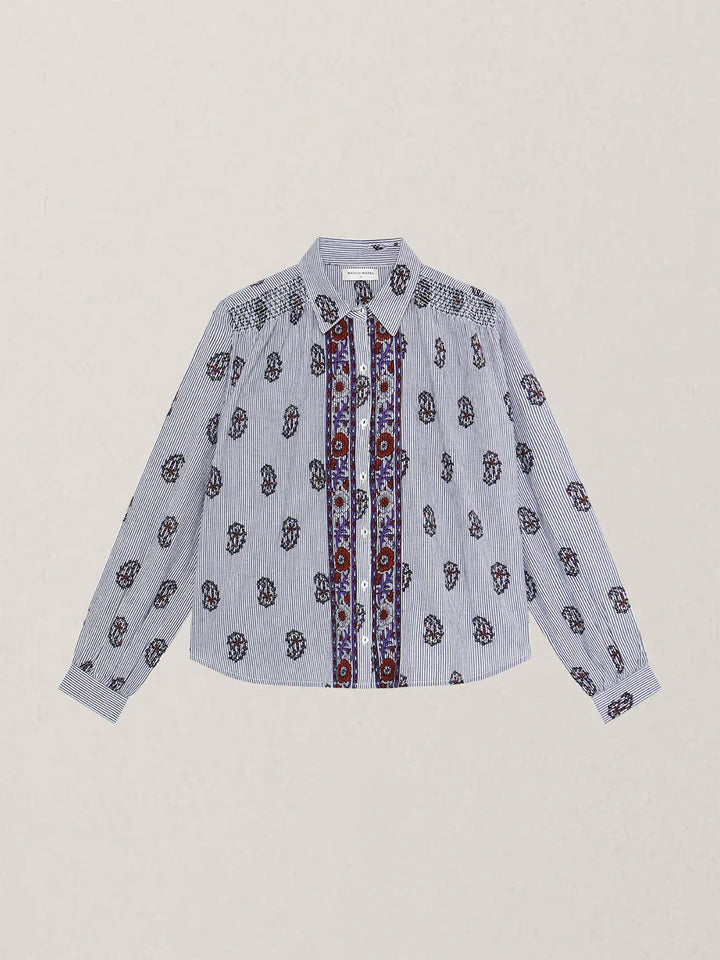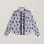 Soft cotton with a light hand forms the base of this blouse, striped in fine lines that carry subtle texture. Its relaxed fit feels effortless.