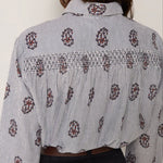 The front placket is richly embroidered with panels in warm reds and indigos, while delicate gathers at the shoulders frame the detail. The balance feels artisanal yet easy to wear.