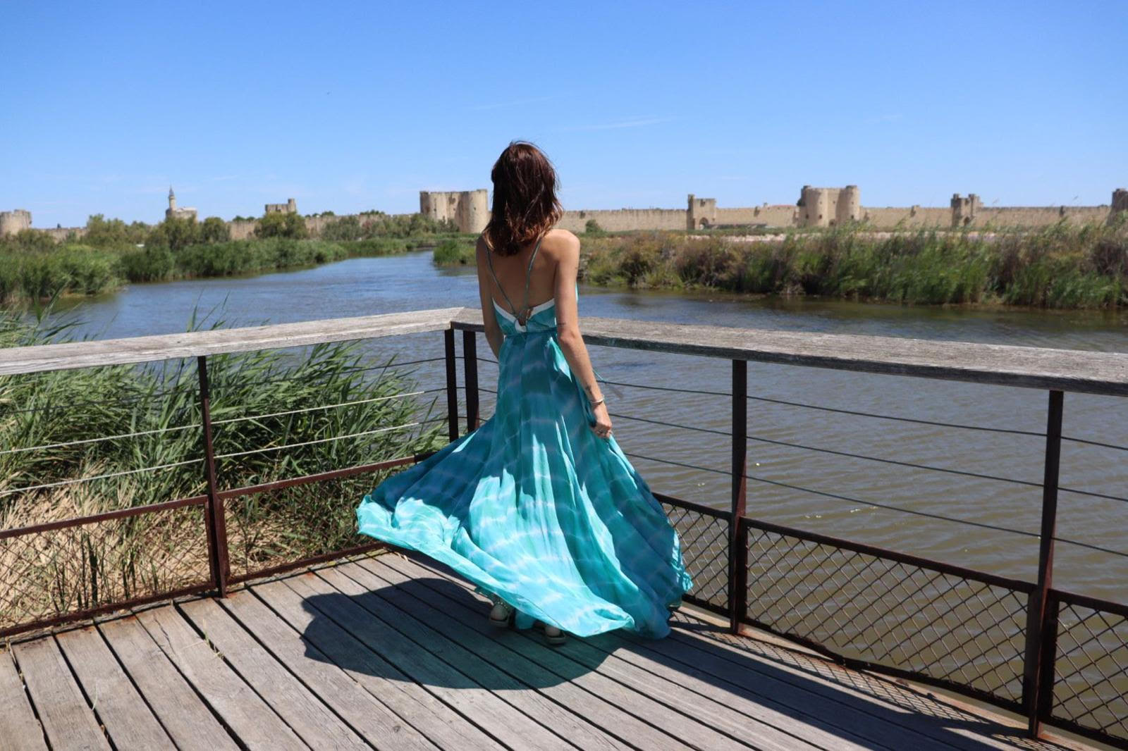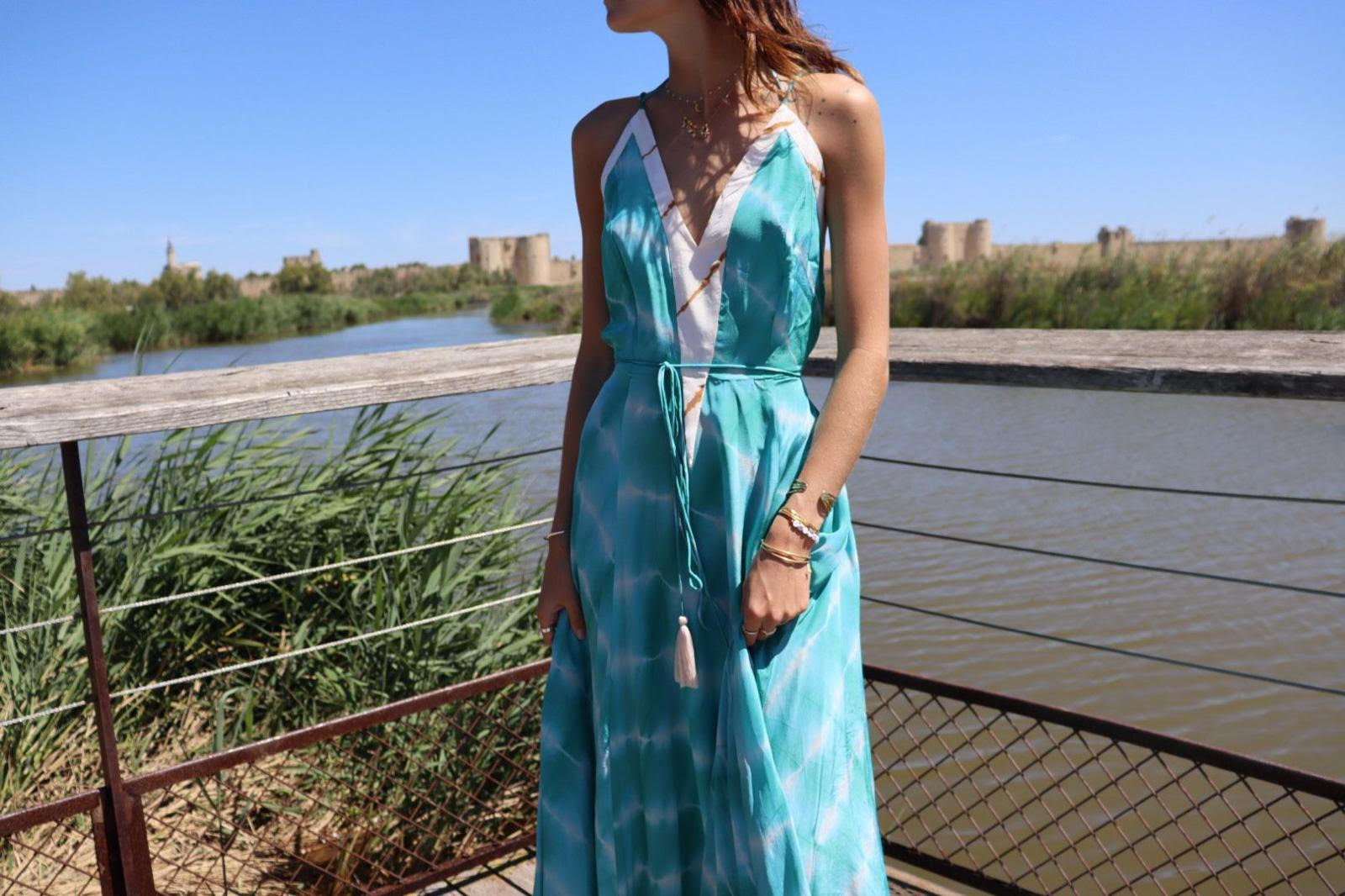 Gorgeous maxi dress with V-neck front and open back. There's thin shoulder straps to lace in the back and wrap and tie around the waist. The skirt is full and flowy creating lovely movement.