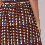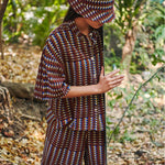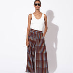 Wide leg trousers in airy and seersucker cotton with blue and brown Riley pattern.
