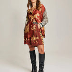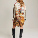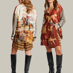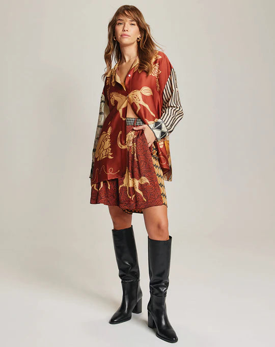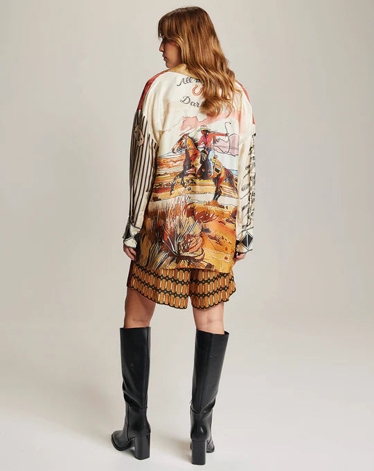 Collared shirt with button closure in Me369's Rodeo pattern with long sleeves and contrasting cuffs.