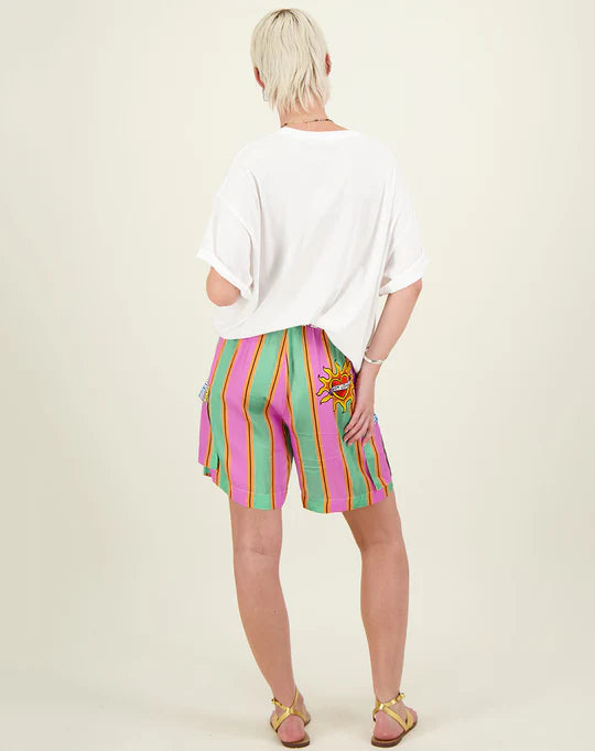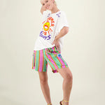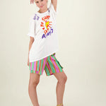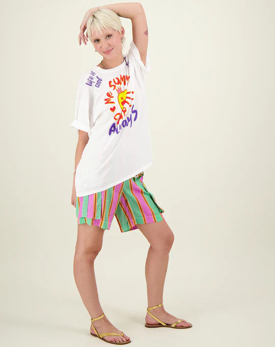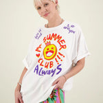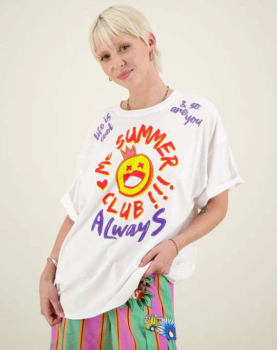 White oversized t-shirt with drop shoulders and short sleeves. Large happy face graphic in the center of the shirt. Reads “Me SUMMER CLUB!!!” “ALwayS” around it. At the shoulder lines it reads, “life is cool” “& so are you”. Pair this tee with the Vanessa Skirt or a pair of shorts for a cute happy look.