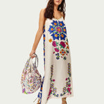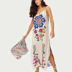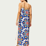 The back showcases a bold all-over floral pattern where blue blooms create a striking geometric arrangement. Delicate adjustable straps with decorative chain detail and flowing maxi silhouette with side slits offer effortless elegance.
