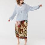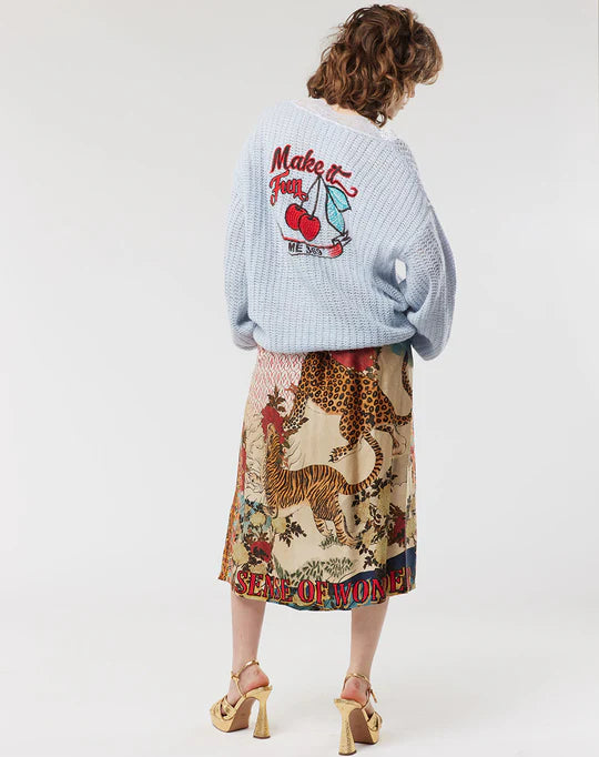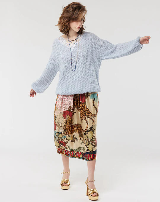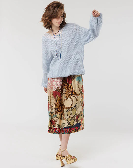 Me369's best selling midi skirt, now in the new multicoloured Oriental print with tigers and leopards printed. Elastic waist.
