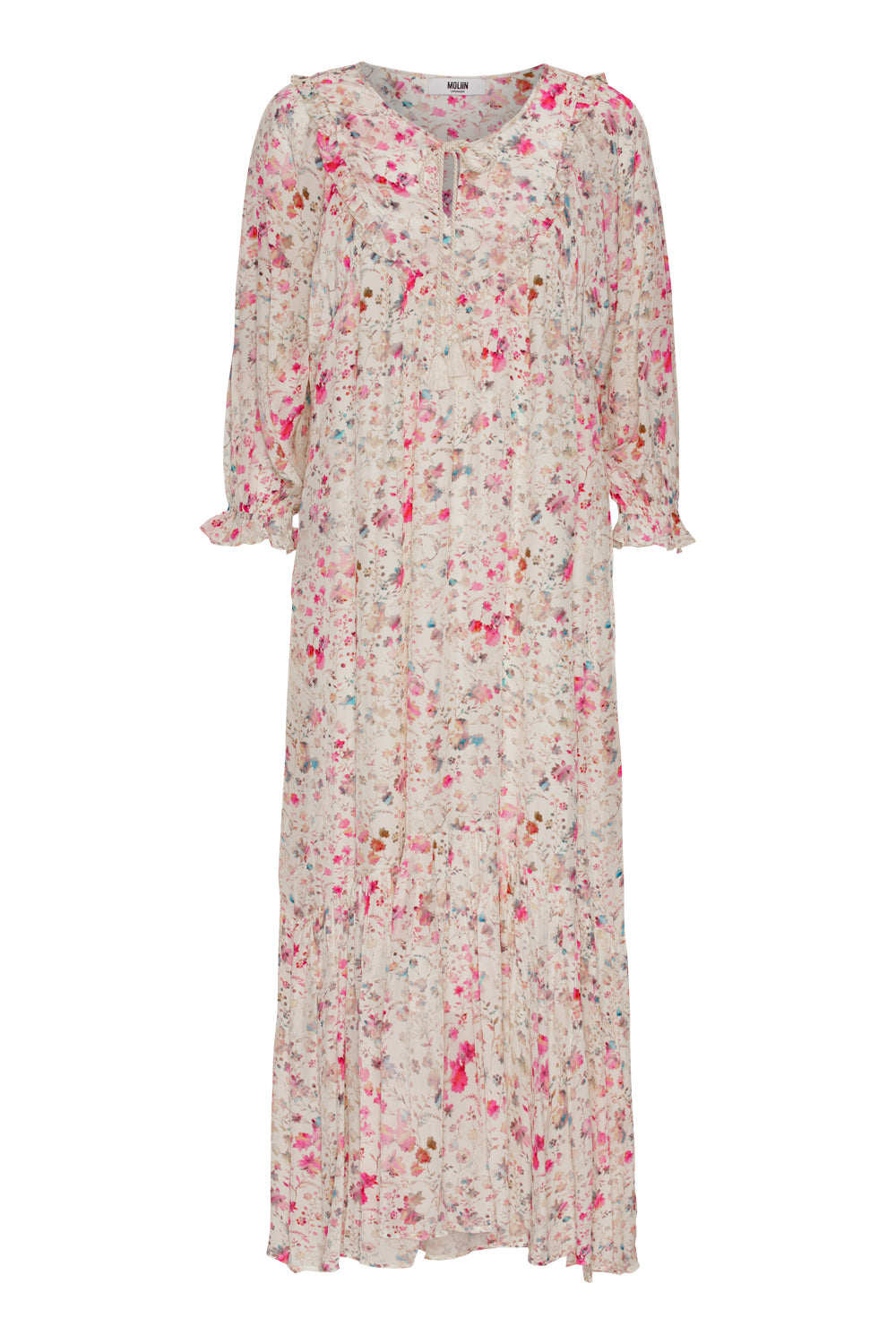 Long dress with round neckline and a tiny slit with tasselled strings attached. It features a circular ruffled line around the chest and a pleated panel along the hem. The sleeves are voluminous and 3/4 length with elastic ends.