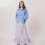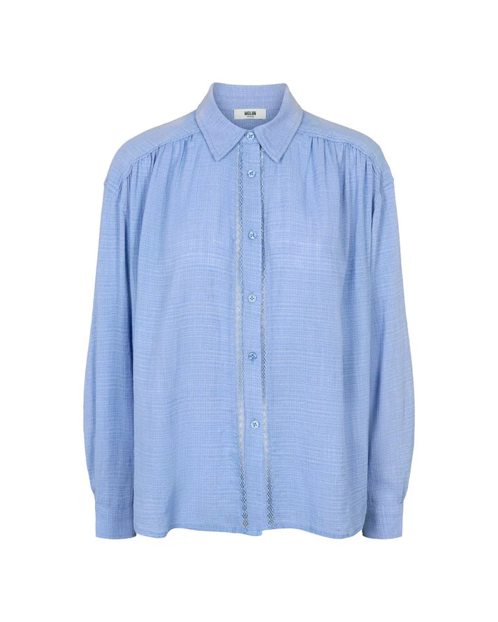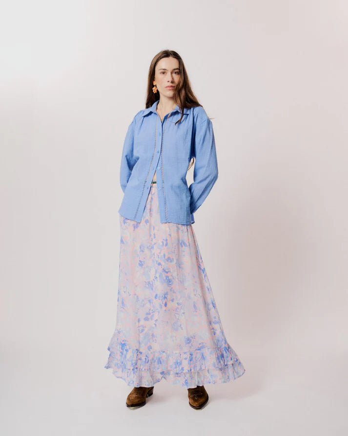 Petunia is a feminine shirt crafted in soft cotton with a textured surface. The shirt has a classic collar and a full button-through front, highlighted by delicate decorative trim details along the placket. Long sleeves are finished with a cuff, keeping the look clean and versatile. An easy everyday shirt with subtle romantic detailing.