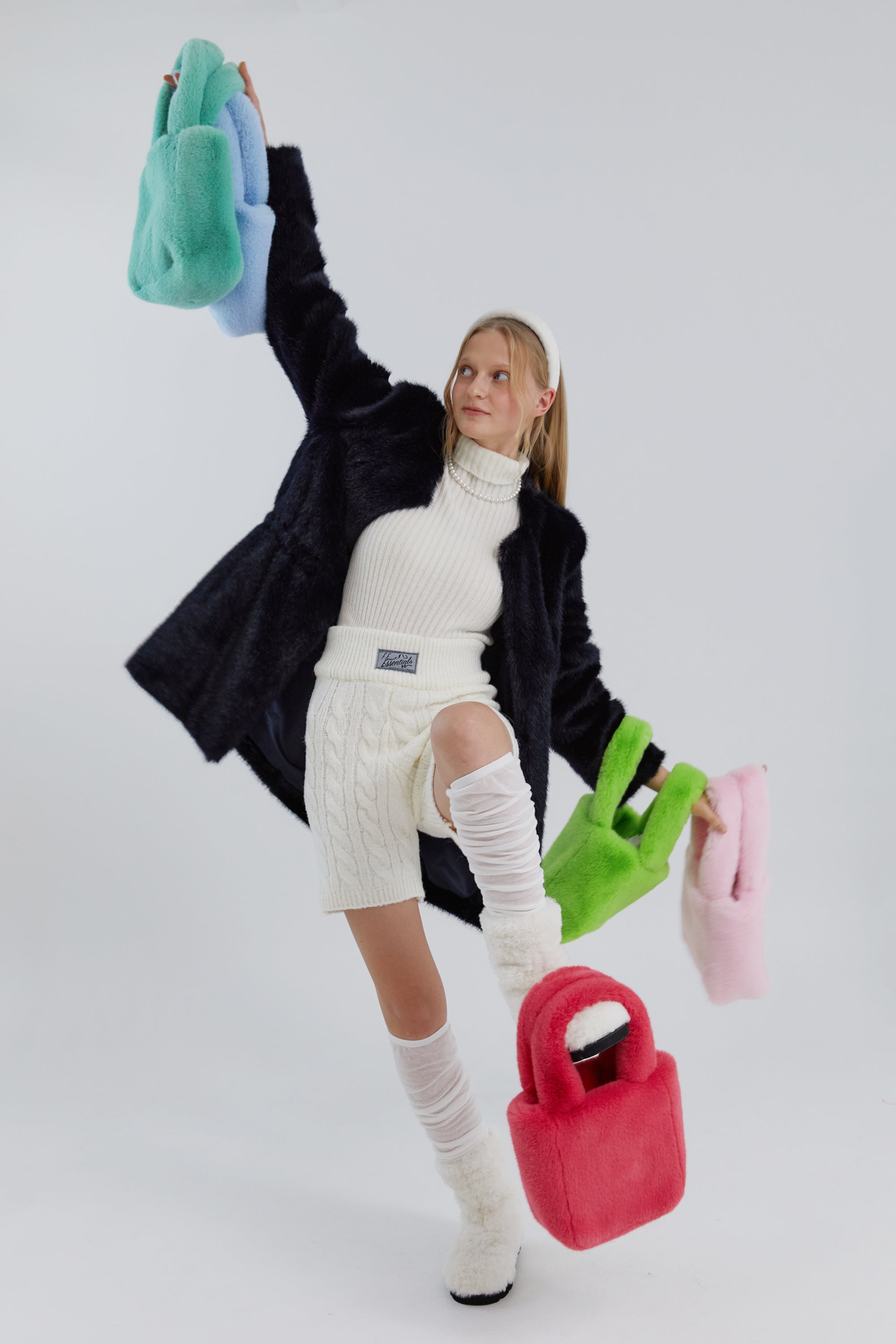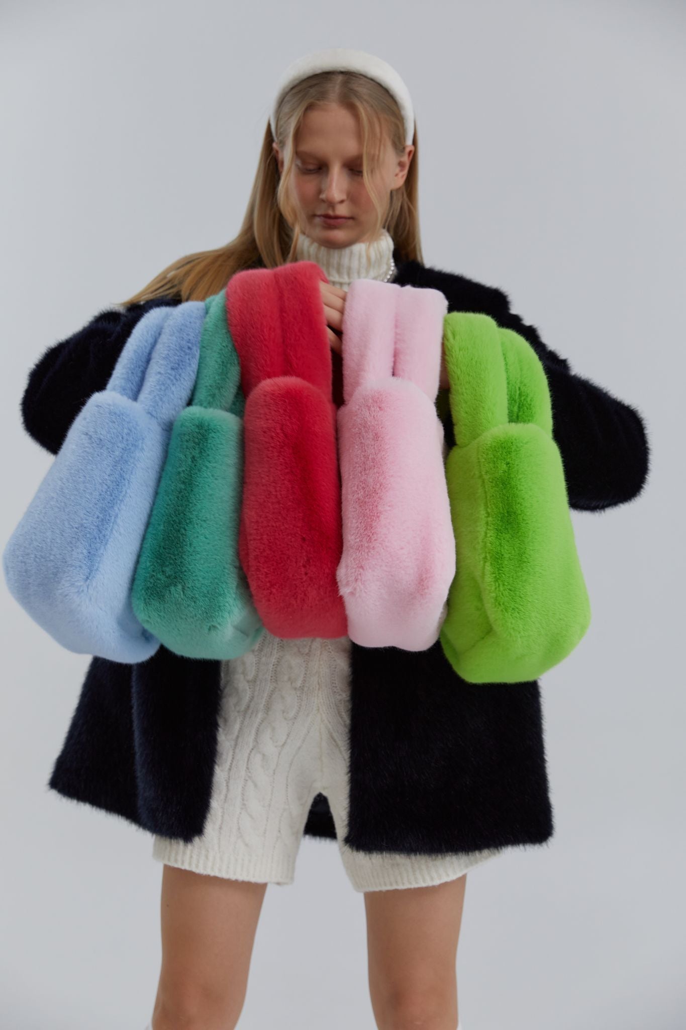 Faux fur bags in fun colours. They have a quare shape with hey a magnetic button closure with short handles.
