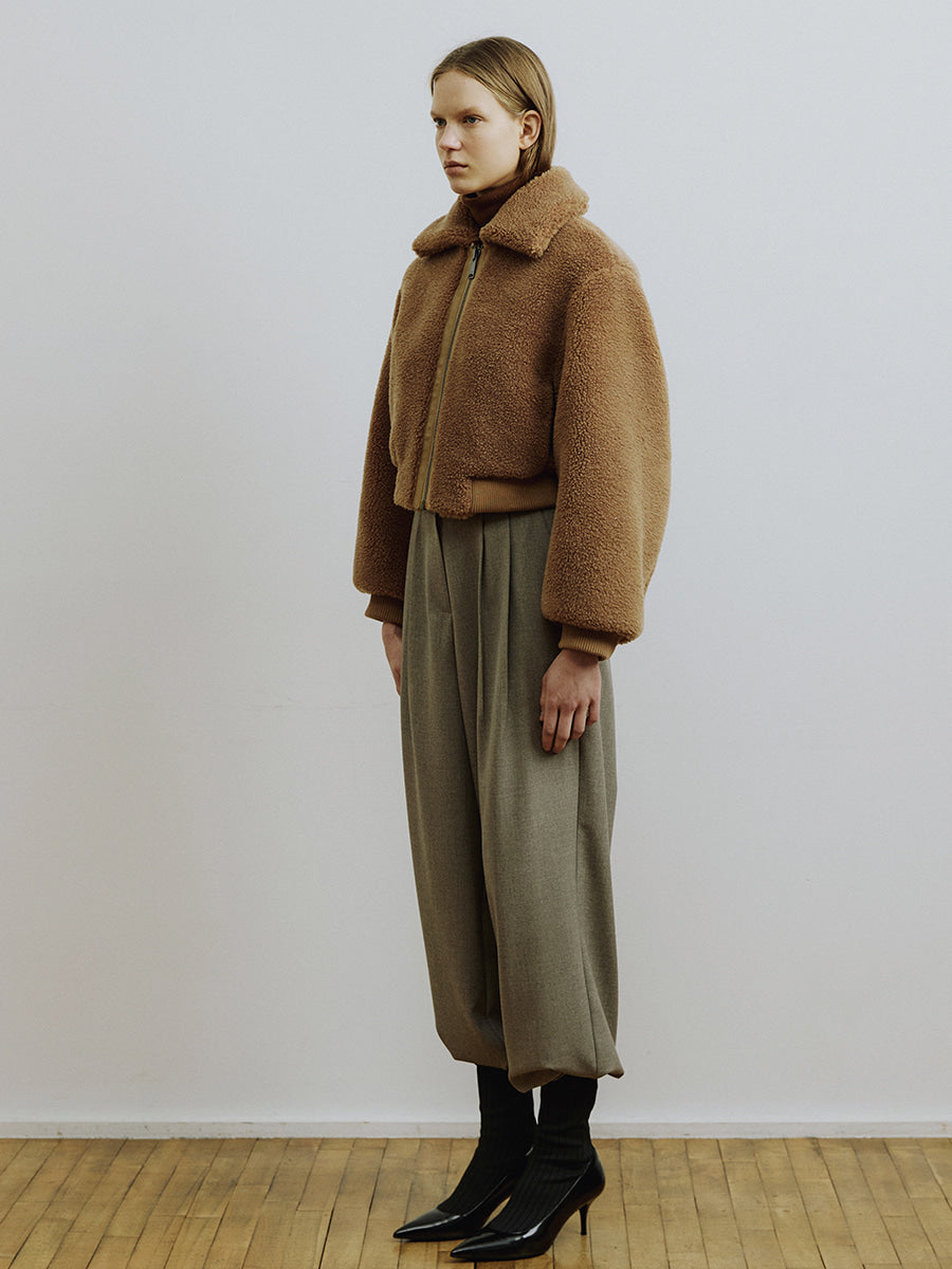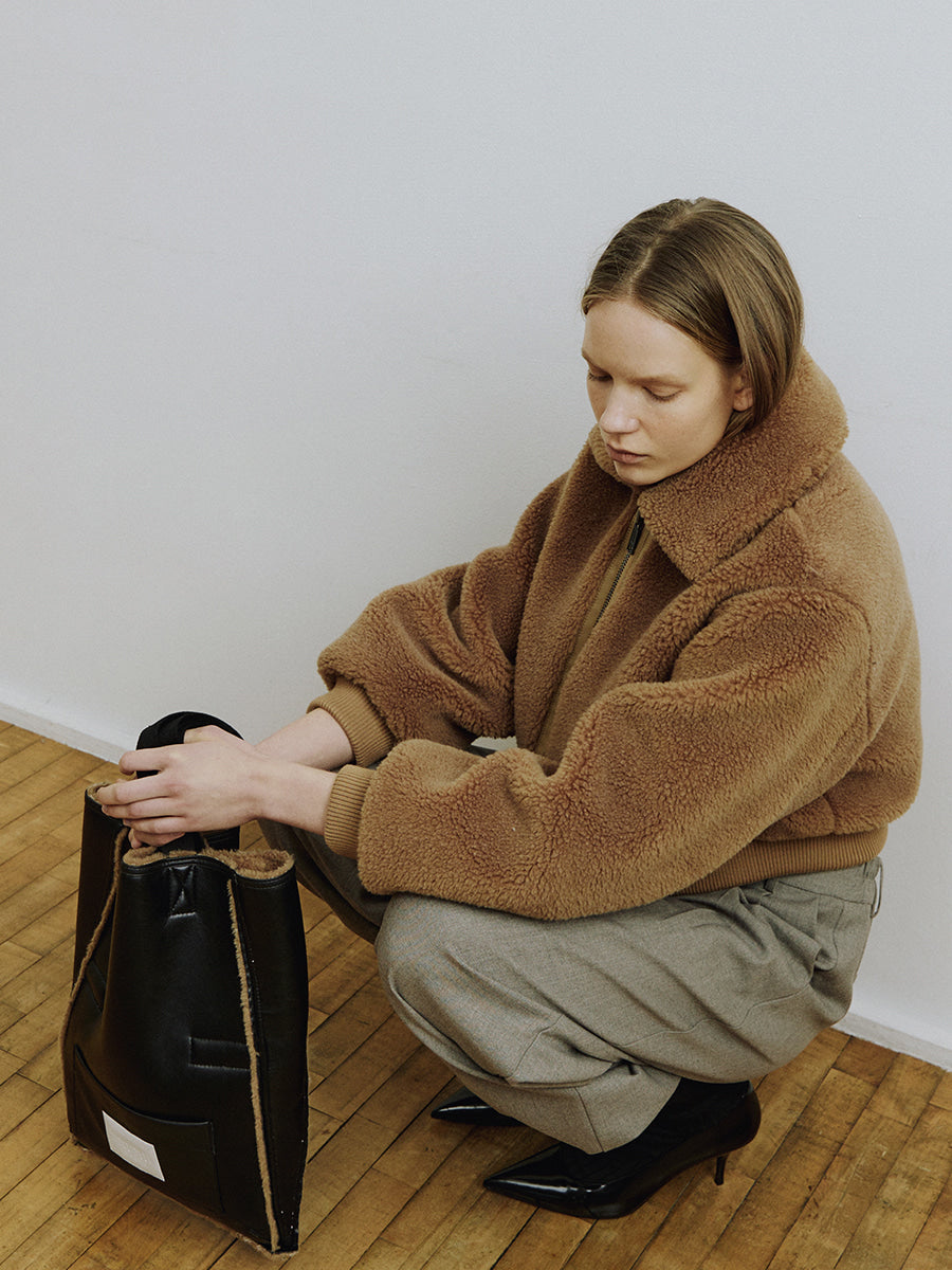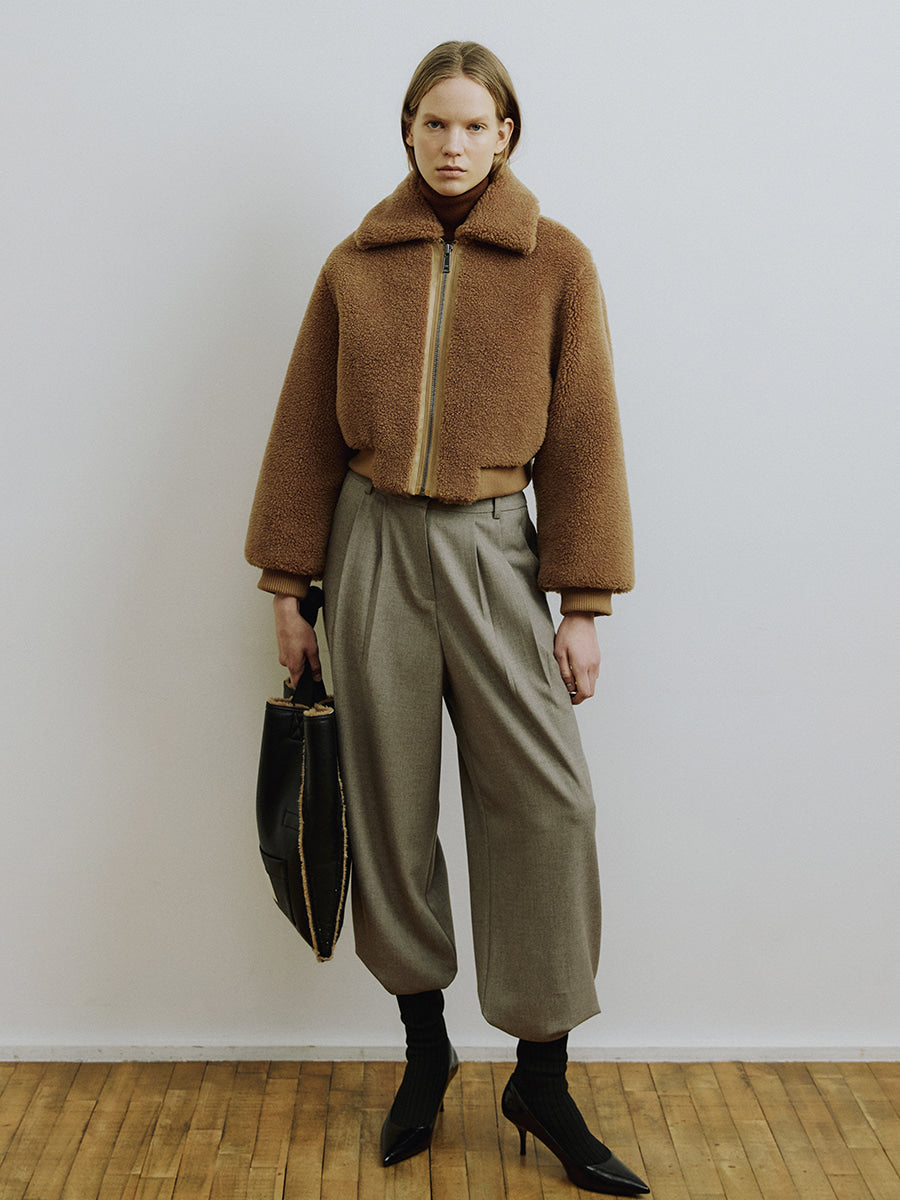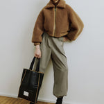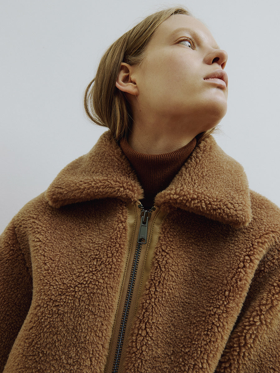 Gege is an aviator styled cropped jacket in faux shearling to keep you warm even during the FW season. The short length and voluminous silhouette add a stylish touch, making it a standout piece for various outfits, from daily wear to street casual looks.