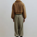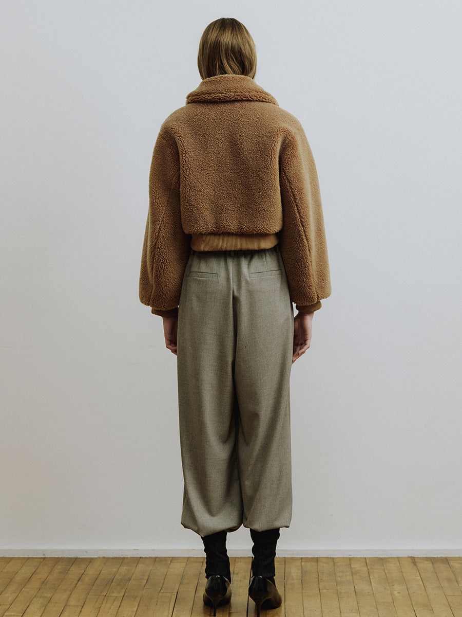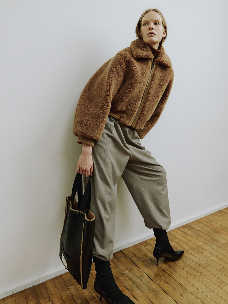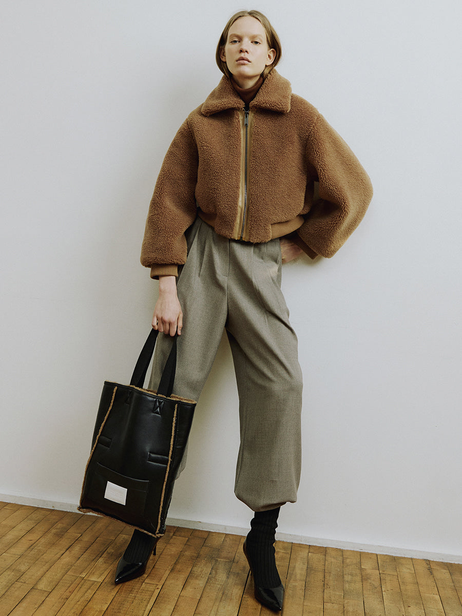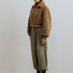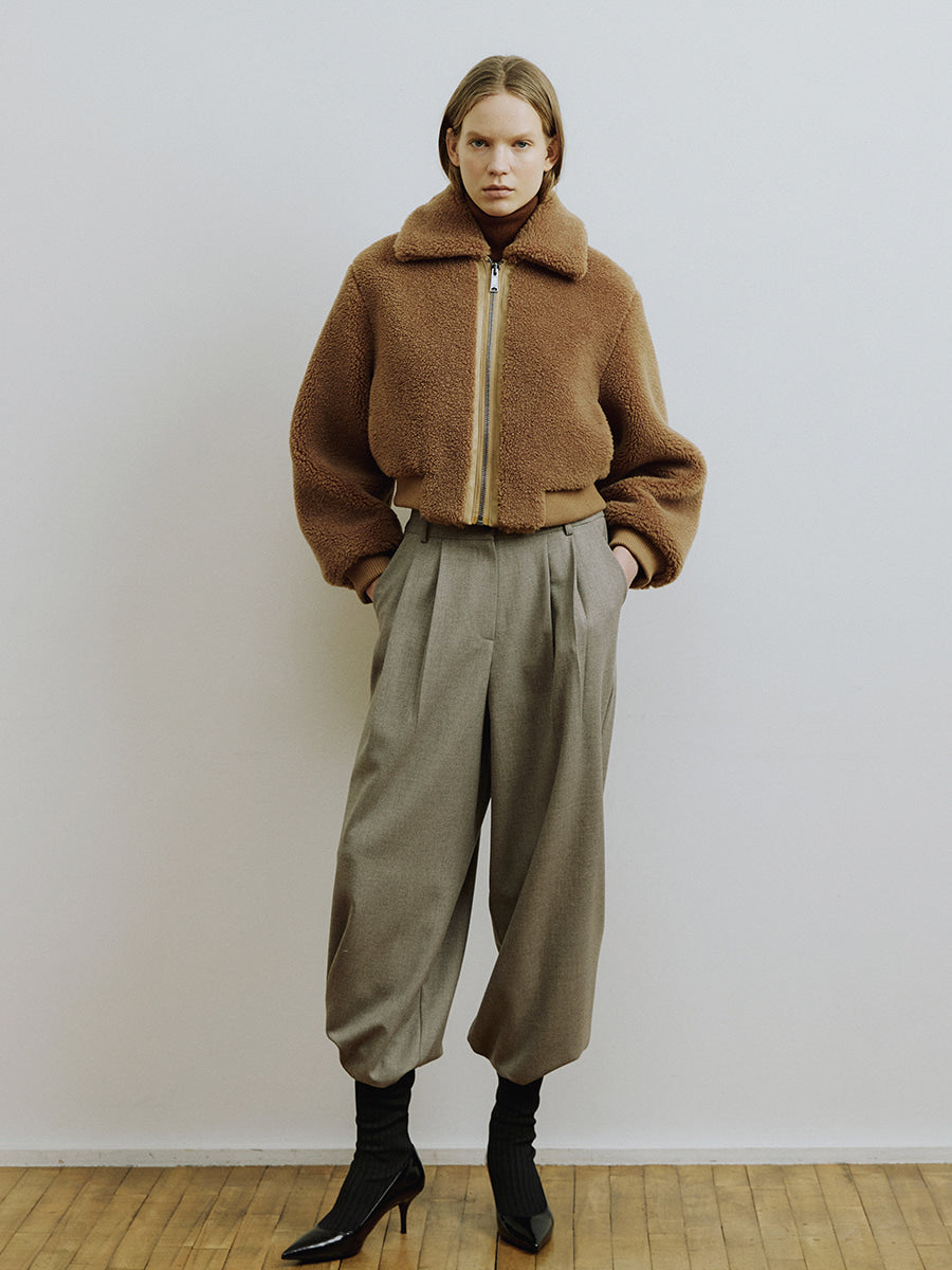 Gege is an aviator styled cropped jacket in faux shearling to keep you warm even during the FW season. The short length and voluminous silhouette add a stylish touch, making it a standout piece for various outfits, from daily wear to street casual looks.
