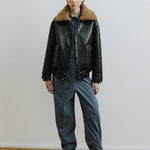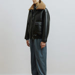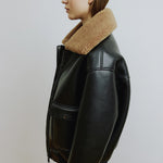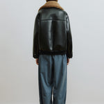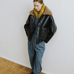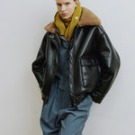 Oversized faux leather jacket with faux fur collar. The matte texture of the black PU material combined with the soft fake fur collar creates a sophisticated mood for the FW season.