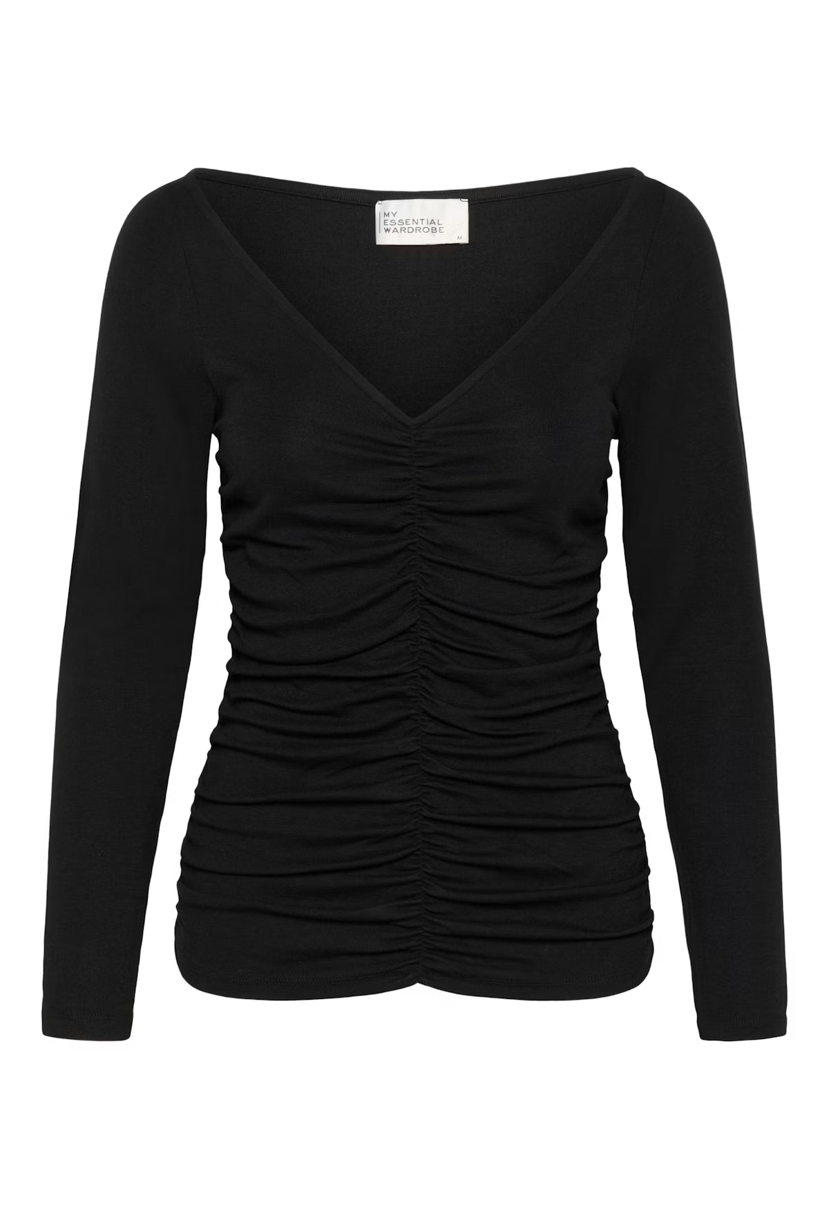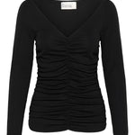 This ruched long sleeve top features a deep V-neckline and a fitted silhouette. The smooth finish and striking front ruching offer an effortlessly sleek look.