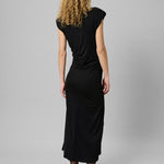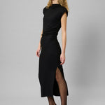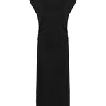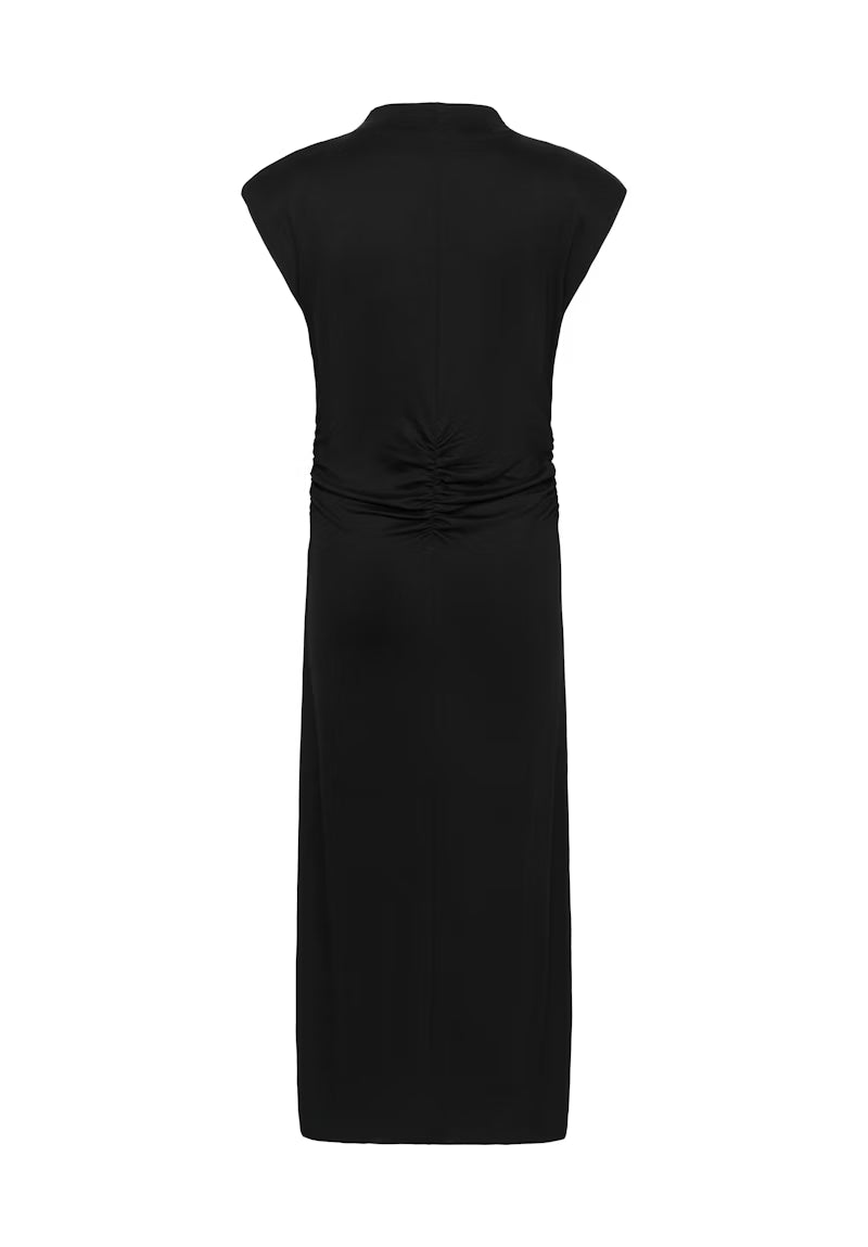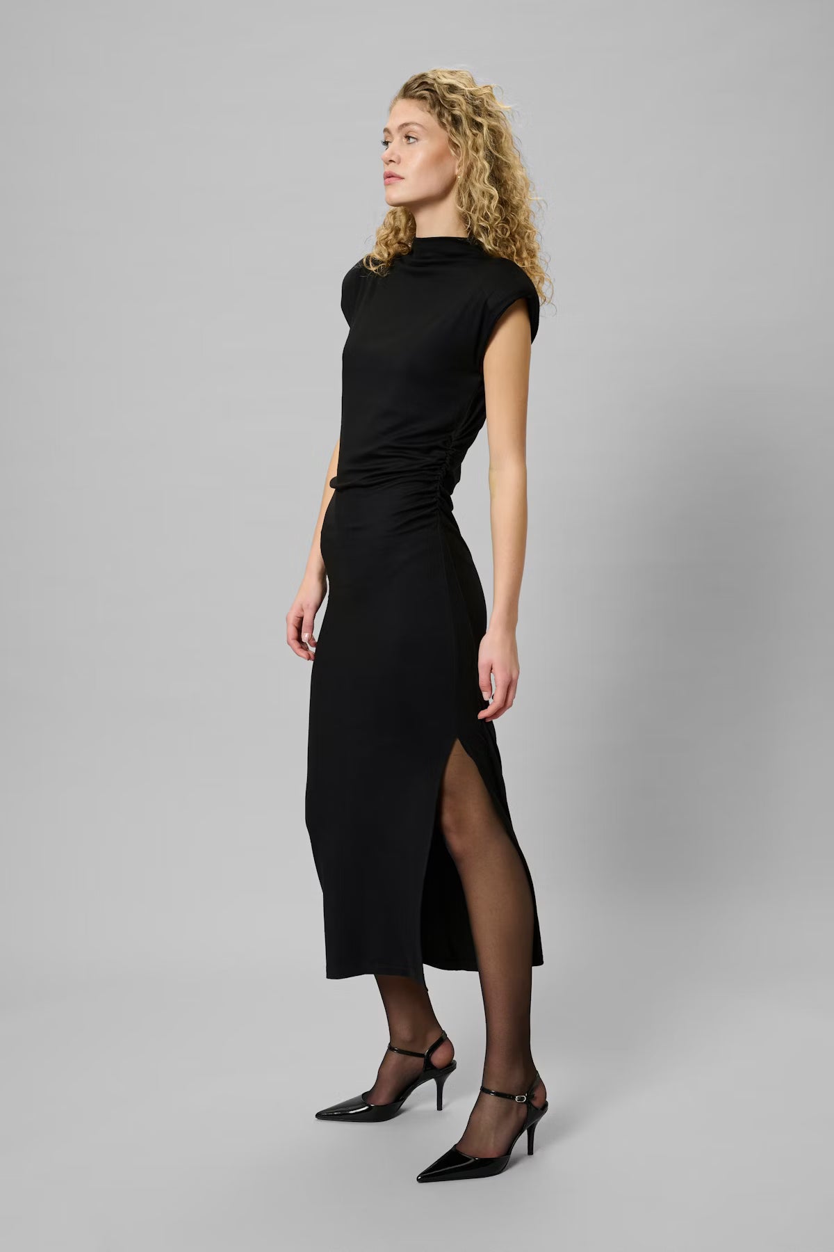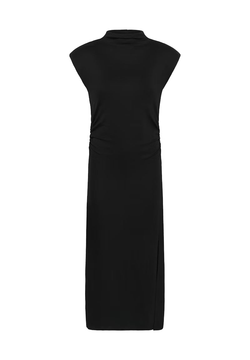 Midi dress with high neckline, cap sleeves, ruched side detailing, and straight silhouette. Features a sleek side slit for a streamlined, modern look.