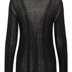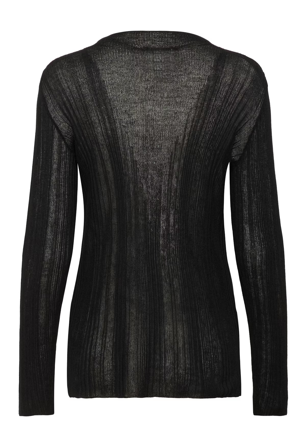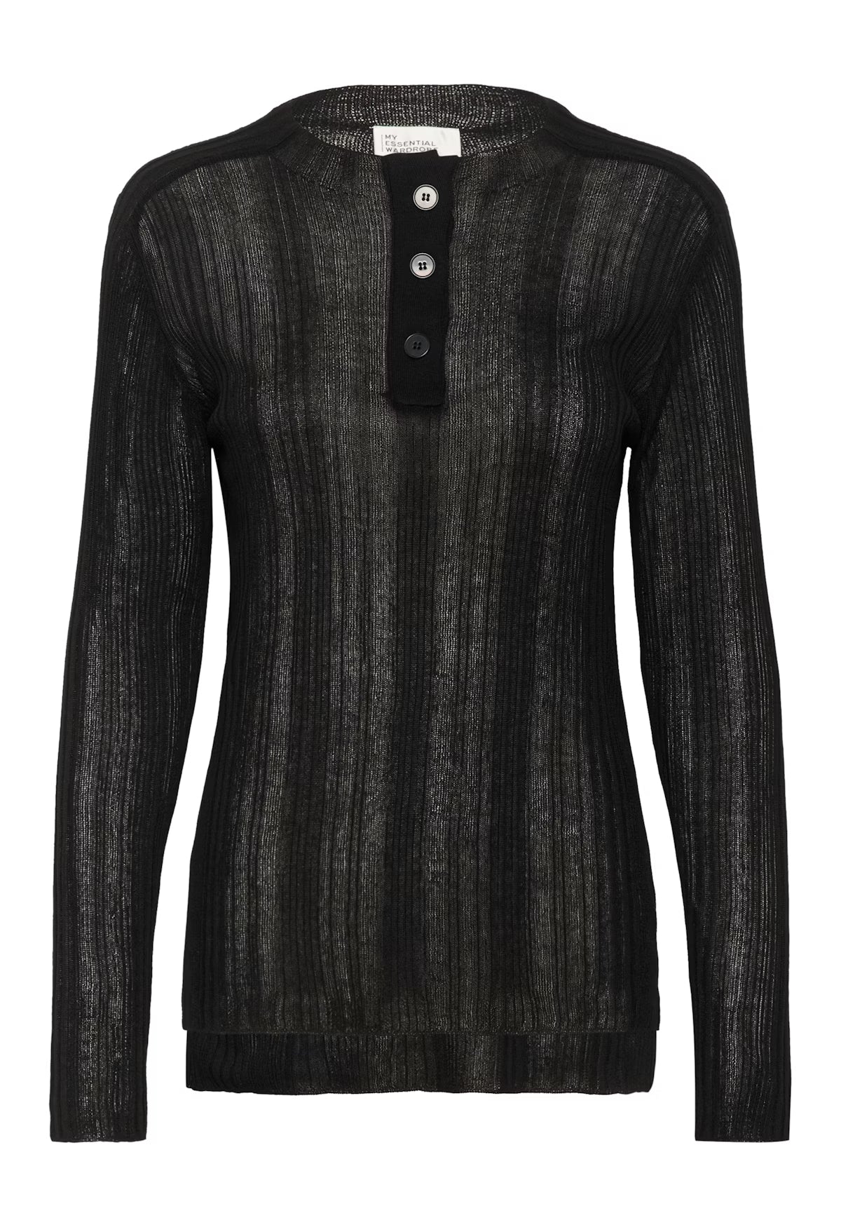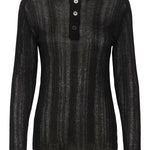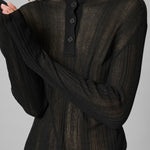 Ribbed long sleeve top features a semi-sheer texture with a streamlined fitted silhouette. Classic crew neckline and bold buttoned half-placket for a modern edge.