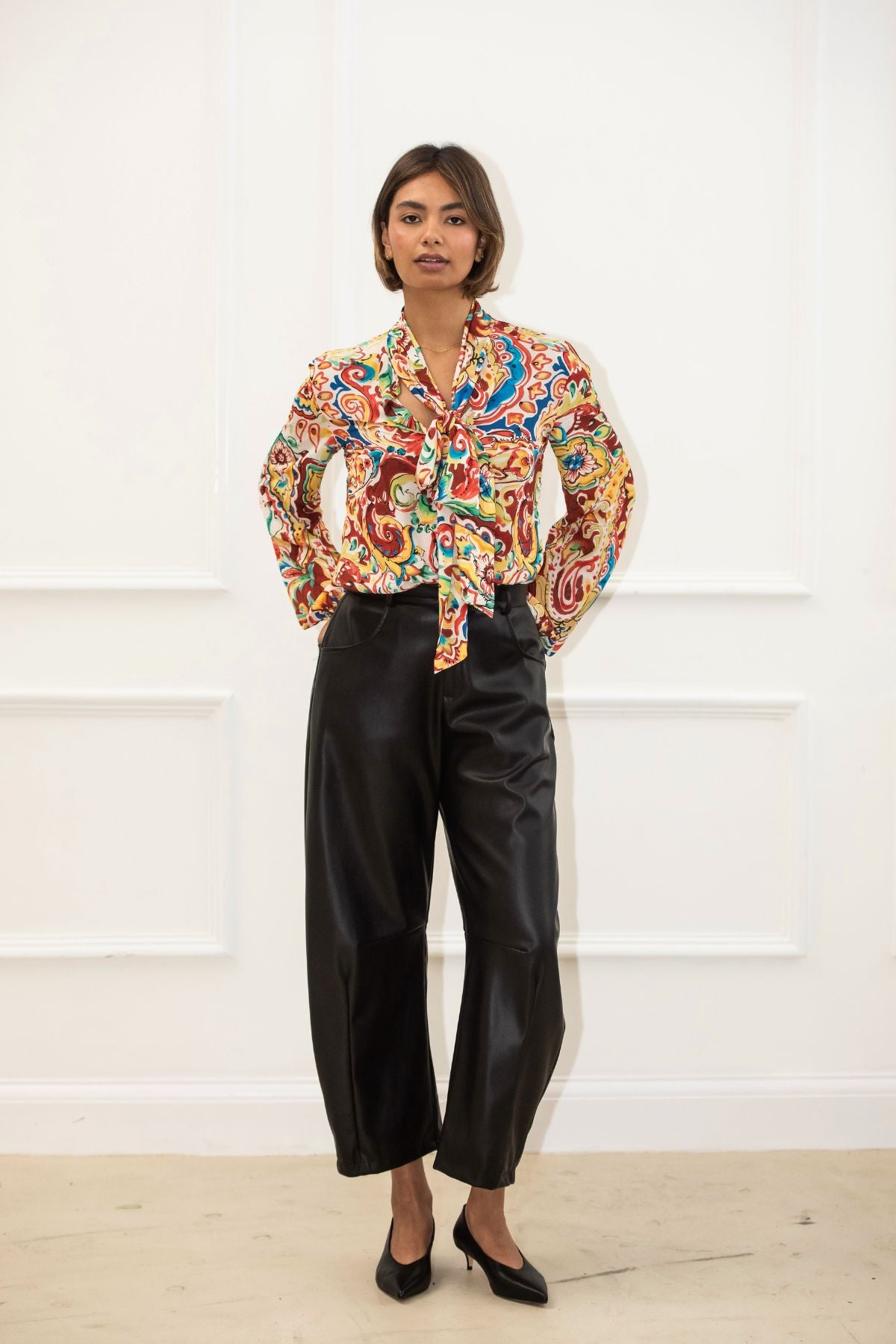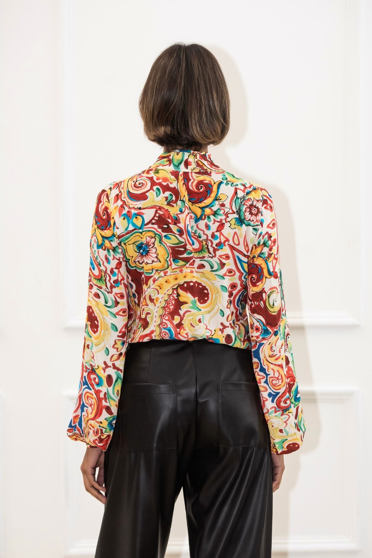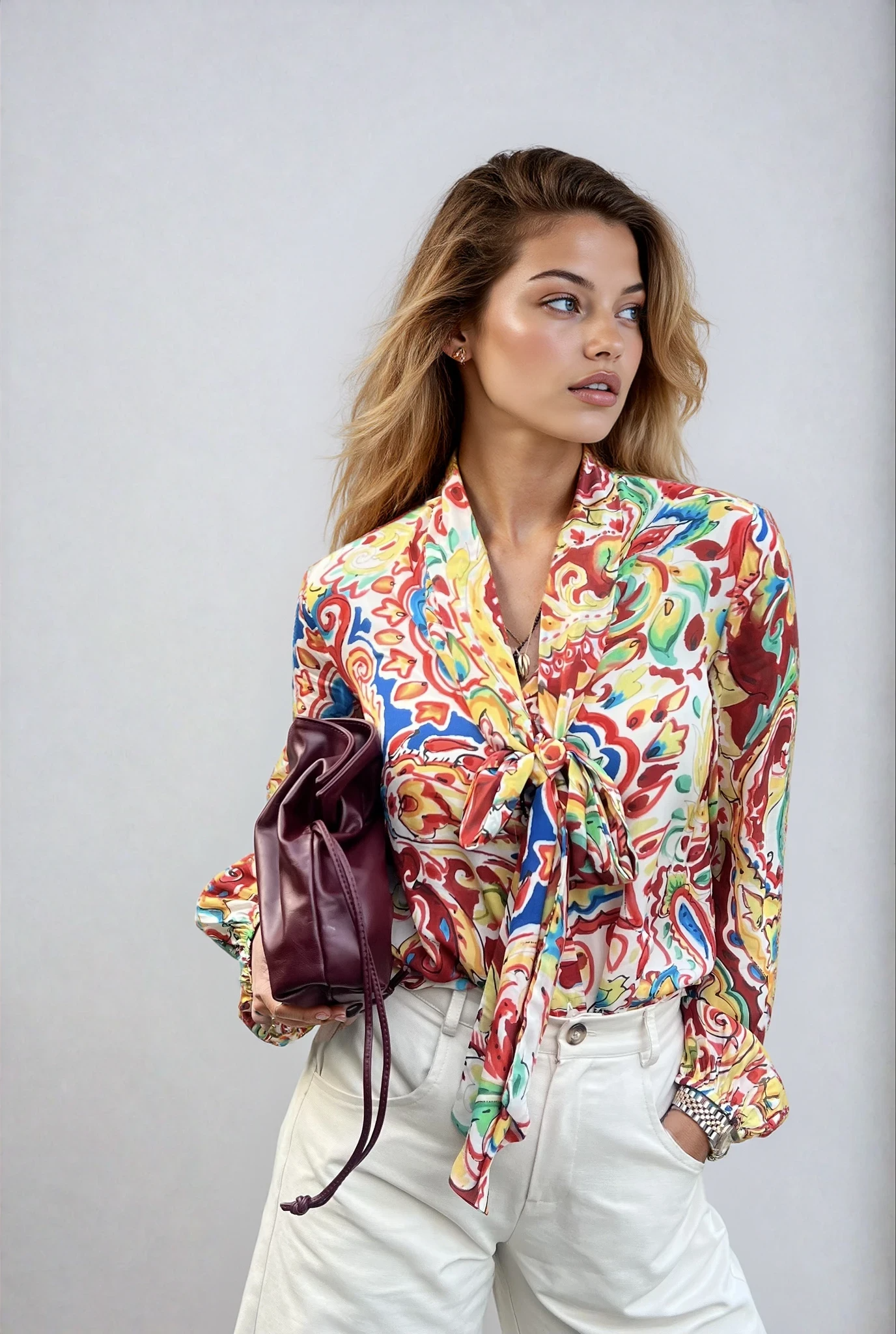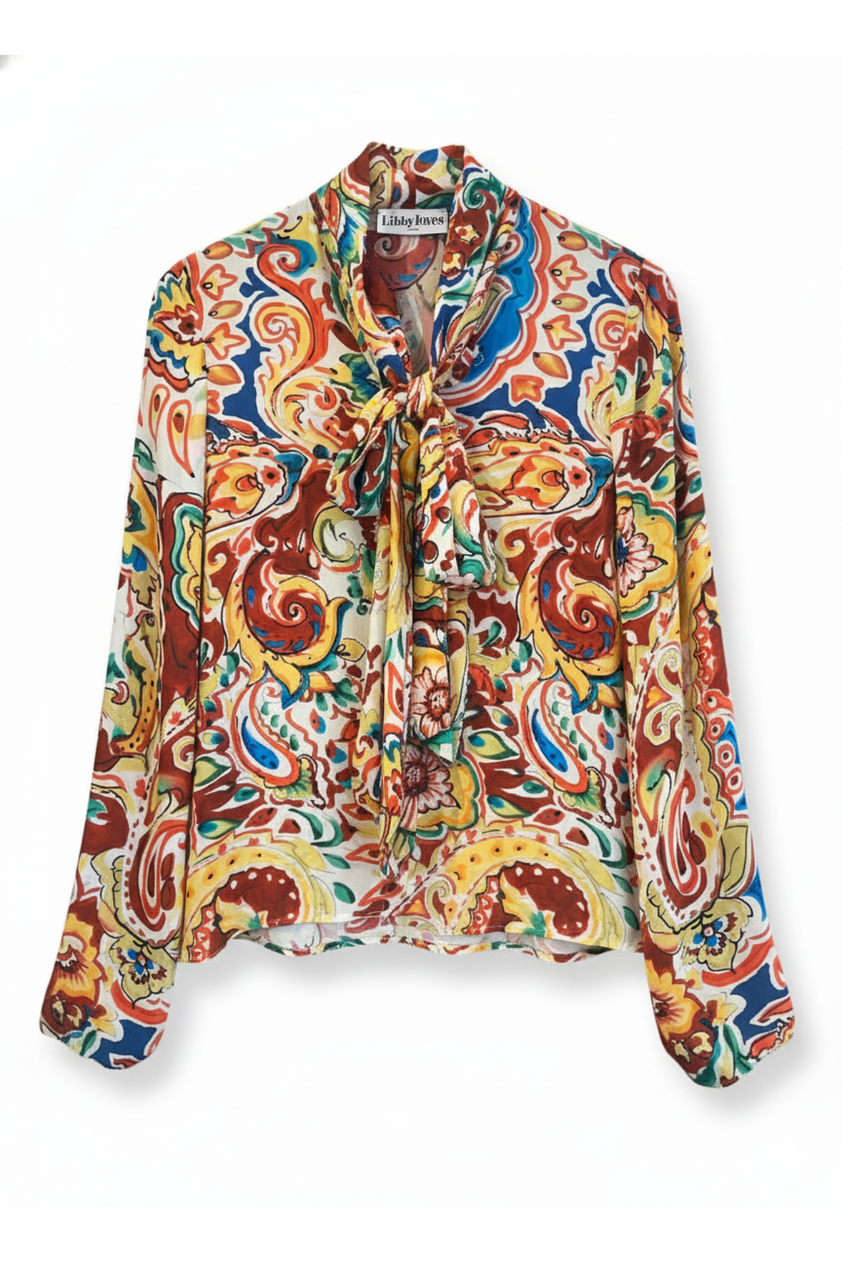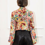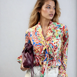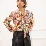The blouse is a vibrant statement piece featuring a bold, multicolored abstract floral pattern in rich shades of red, blue, green, and yellow against a cream base. Crafted from a lightweight, flowy fabric, it drapes elegantly and showcases a chic bow tie at the front. Its lively design and sophisticated details make it a versatile choice, pairing perfectly with jeans for a casual yet polished look or with shorts for an effortlessly chic warm-weather outfit.