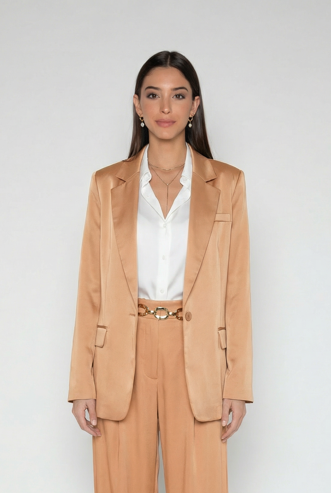 - Silk blazer with a relaxed, tailored silhouette for versatile styling