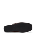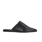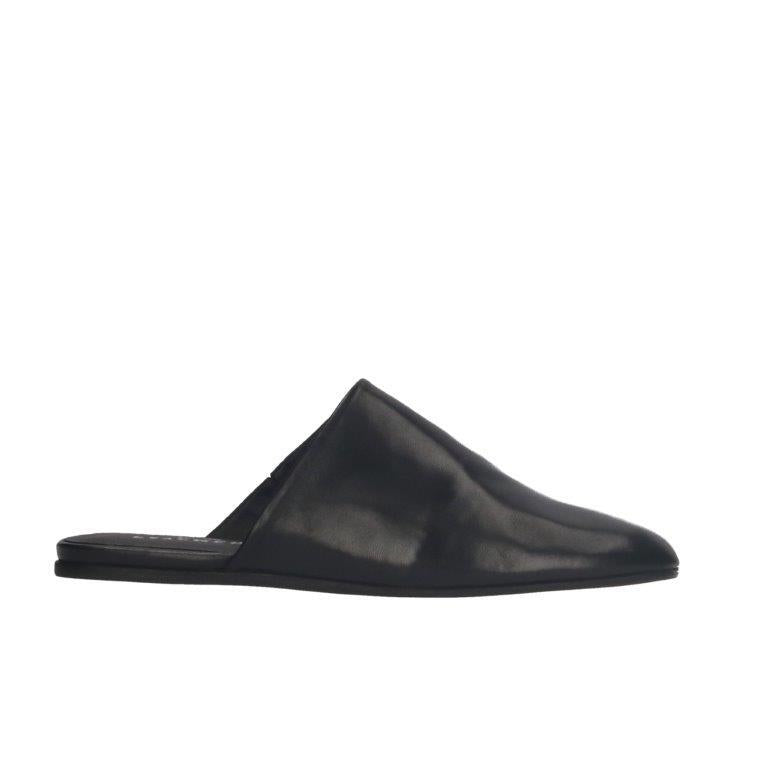 Smooth leather mules with rounded square toe and soft, flat sole.