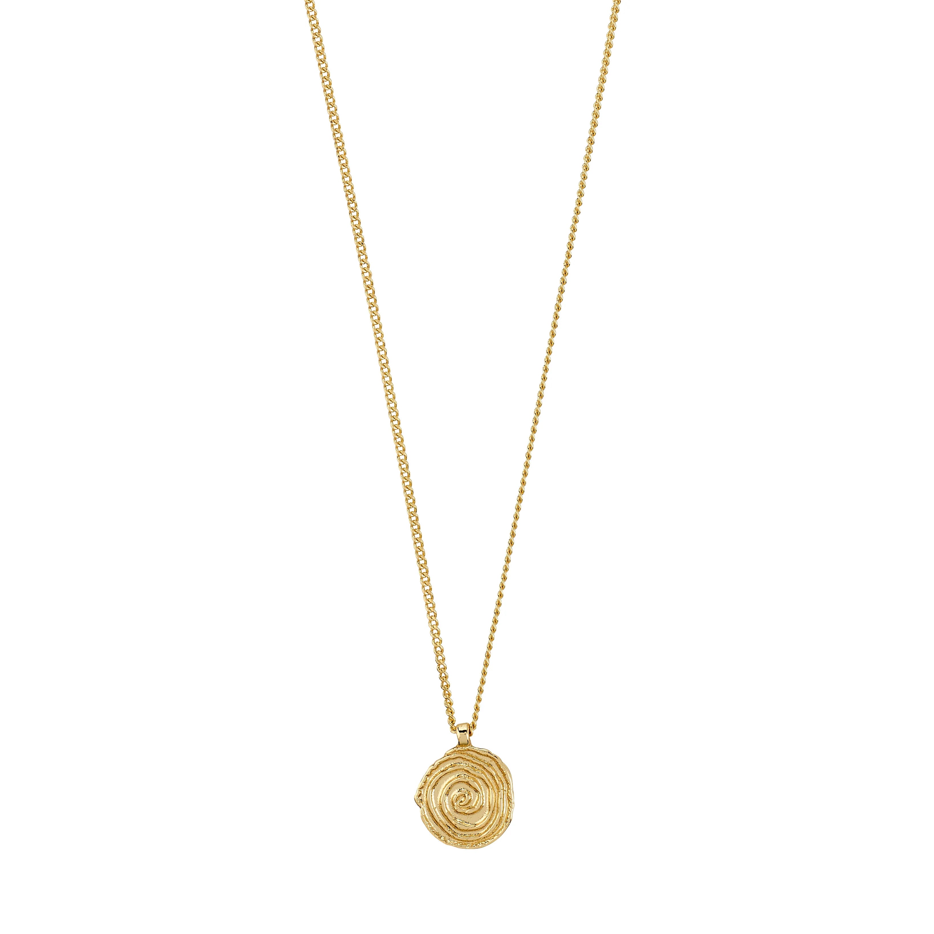 Fresh air, fresh vibe! Meet your new all-time favourite: the AIR necklace from Pilgrim. A sleek gold-plated chain with a coin pendant that glows with handcrafted charm and Nordic soul. The spiral motif nods to ancient Scandinavian jewellery traditions, reimagined for today’s minimalist cool. Style it with a cropped knit and wide-leg jeans for an effortlessly boho-chic vibe. Measures 40 cm + 12 cm extension and crafted from 99% recycled materials — fashion that feels good and does good.