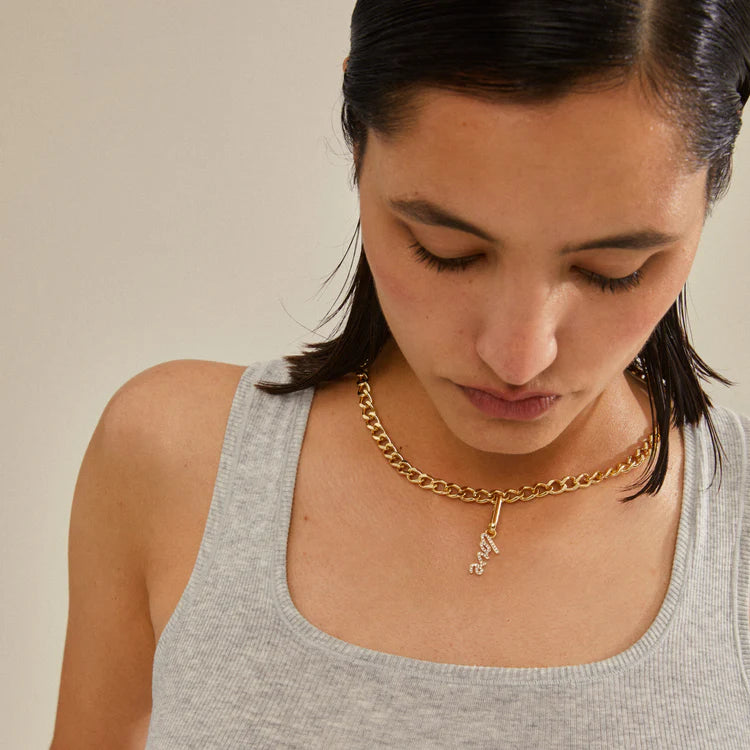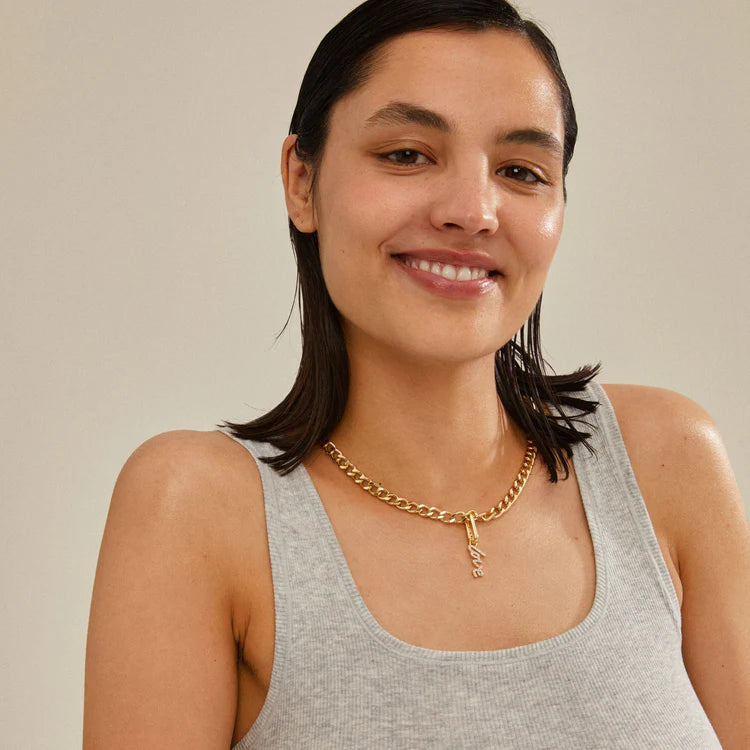 Make your own statement with Pilgrim's beautiful charms. With the sparkling gold-plated Love pendant, you can add a unique and personalised touch to your style. Attach the pendant to a chunky curb chain or a black leather cord for a simple look or combine with other letters and symbols for a personalised styling that makes sense for you. The pendant is made of 98% recycled material, - a responsible choice, both for you and our planet.