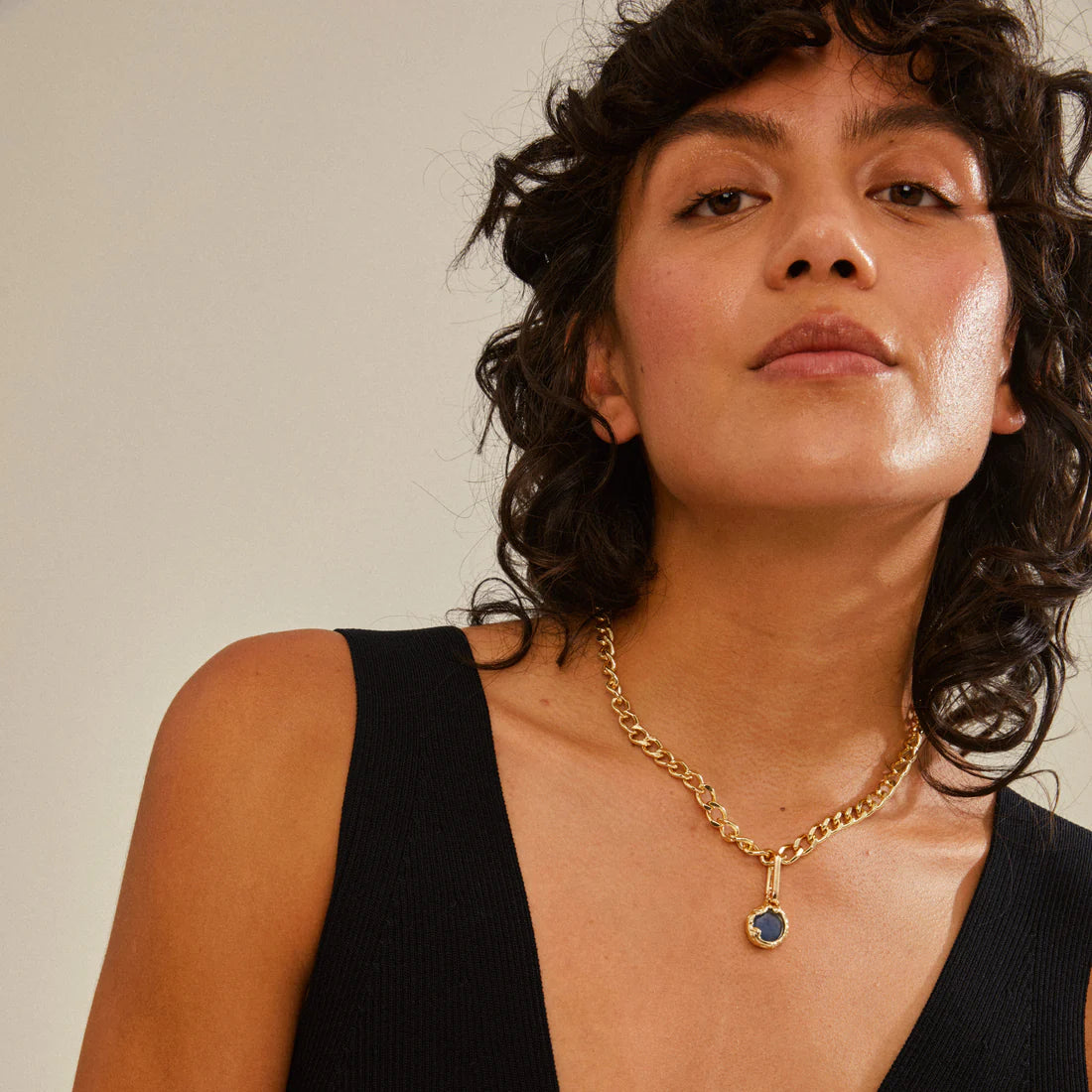 Make your own statement with Pilgrim's beautiful charms. With the gold-plated pendant with a blue composite stone, you can give your style a unique and personalised look. Attach the pendant to a chunky curb chain or a black leather cord for a simple look or combine with other letters and symbols for a personalised styling that makes sense for you. The pendant is made of min. 75% recycled material, - a responsible choice, both for you and our planet.