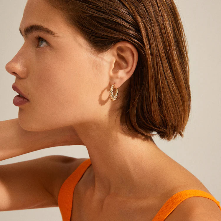 Get ready for new adventures with the gold-plated Eileen huggie hoops as part of your spring look. The earrings' beautiful twisted silhouette creates an eye-catching accessory that exudes warm and harmonious boho-inspired vibes. The soft twirls bring to mind soft waves and balmy evenings. Style with a colourful outfit for a free-minded look.