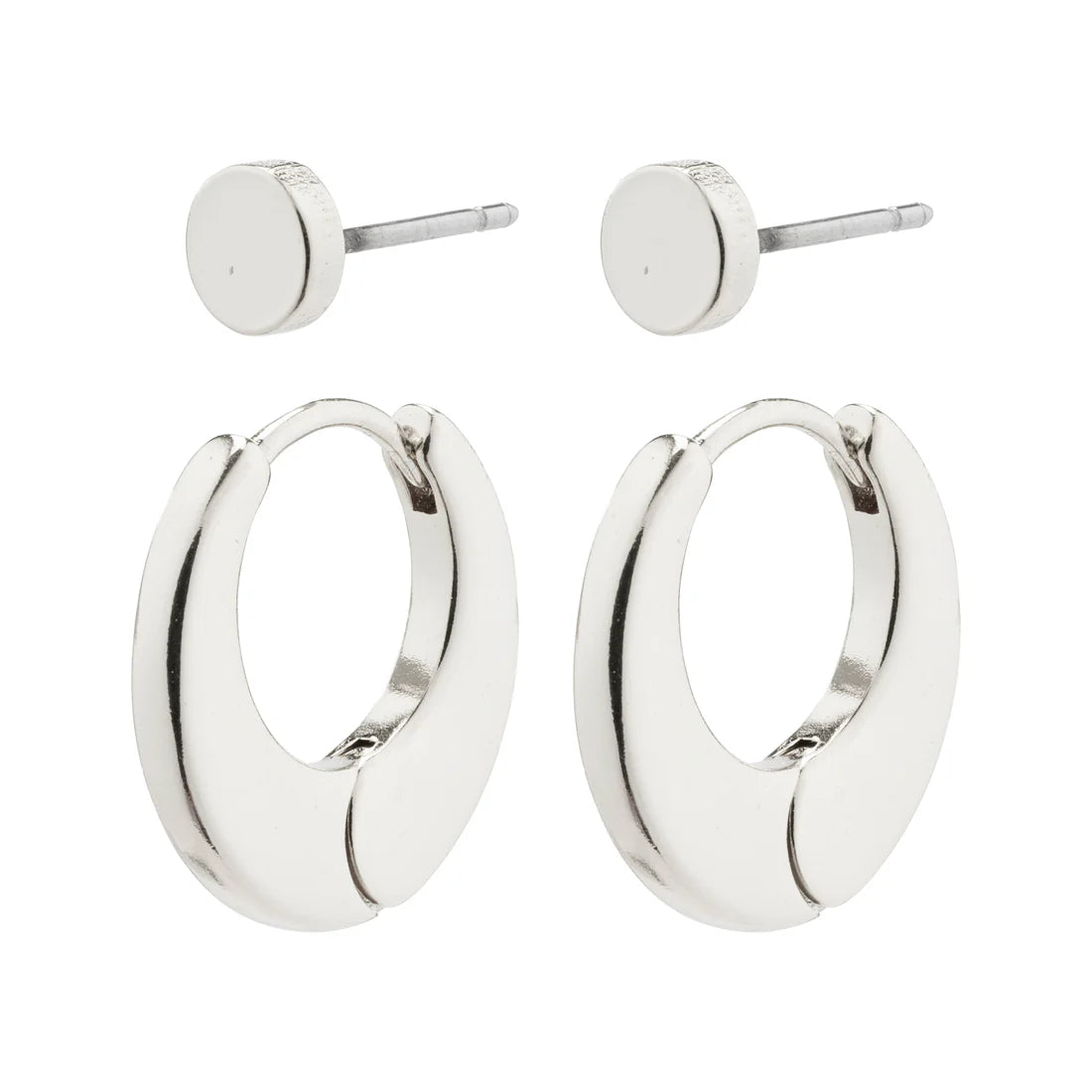 Embrace the retro vibes with the silver-plated 2-in-1 set from Pilgrim's Classics collection. The small ear studs and chunky huggie hoops give you the perfect accessories for a stylish vintage-inspired look with a focus on cool shapes and shiny details. The curved crescent shape of the earrings gives a harmonious and peaceful look.
