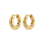 Shine like the night sky! Gold-plated chunky huggie hoops with an easy-to-use click clasp and petite Preciosa crystals that capture the magic of a starry night. This season's ultimate go-to piece, perfect for adding a hint of sparkle to both everyday and festive moments. Wear them alone for an effortless statement or pair with other earrings for a personal stacked vibe. Your new must-have for this season's looks! The earrings are made with 97% recycled material as a testament to our love for the planet.