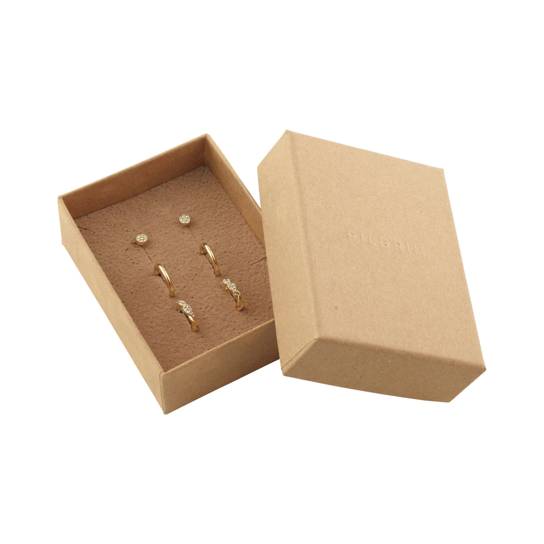 Open up your heart with this gold-plated gift set of three sets of earrings from Pilgrim, a series of recycled items made from a min. of 75% recycled material. The gift box contains crystal earrings, glossy semi hoops and semi hoops with crystal-studded twists. A set of basic pieces that can be worn individually or in beautiful combinations if you have several ear piercings.