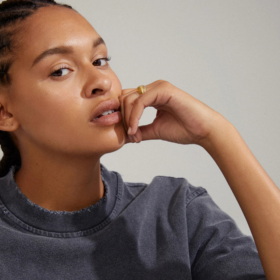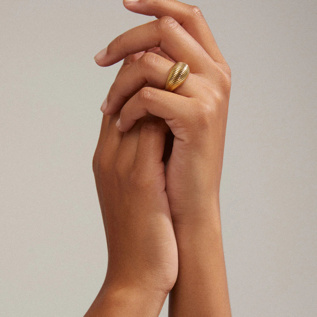 Get your groove on! Ring with simple curvy design and a twist in the form of groove textures in the surface. A true classic, with lots of character and uniqueness. Let the ring shine on its own or style with your favourite pieces for an upscale look. The ring is a recycled item and thus made from a min. of 75% recycled material.