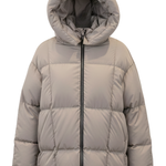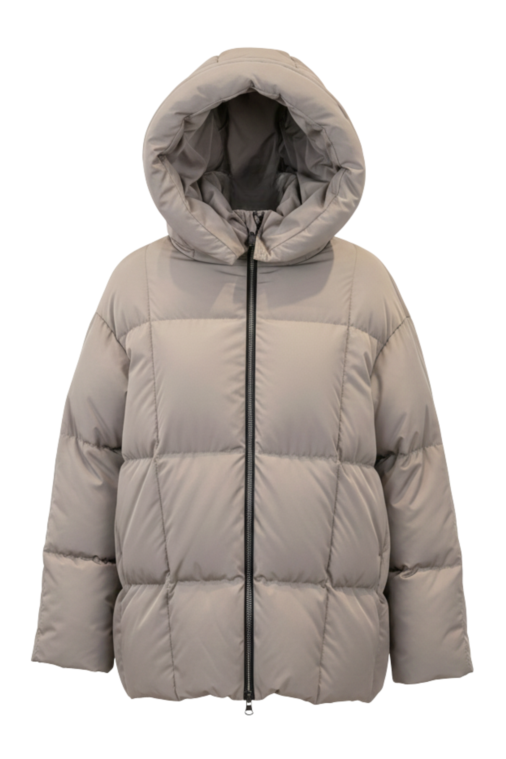 Oversized puffer coat from Annie Paris. Rounded cut with dropped shoulder and hood. Slightly longer to keep you warm and with zipped side pockets.
