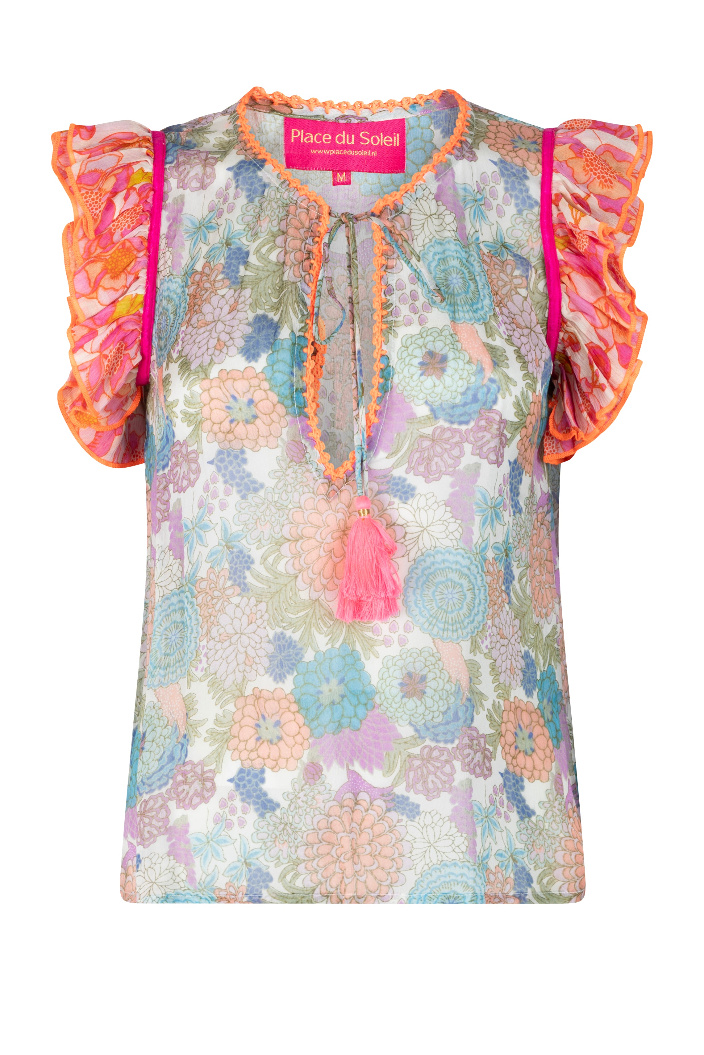 Multicoloured top with flower print and contrasting, short frill sleeves. Featuring a slit V neckline with orange trimming.